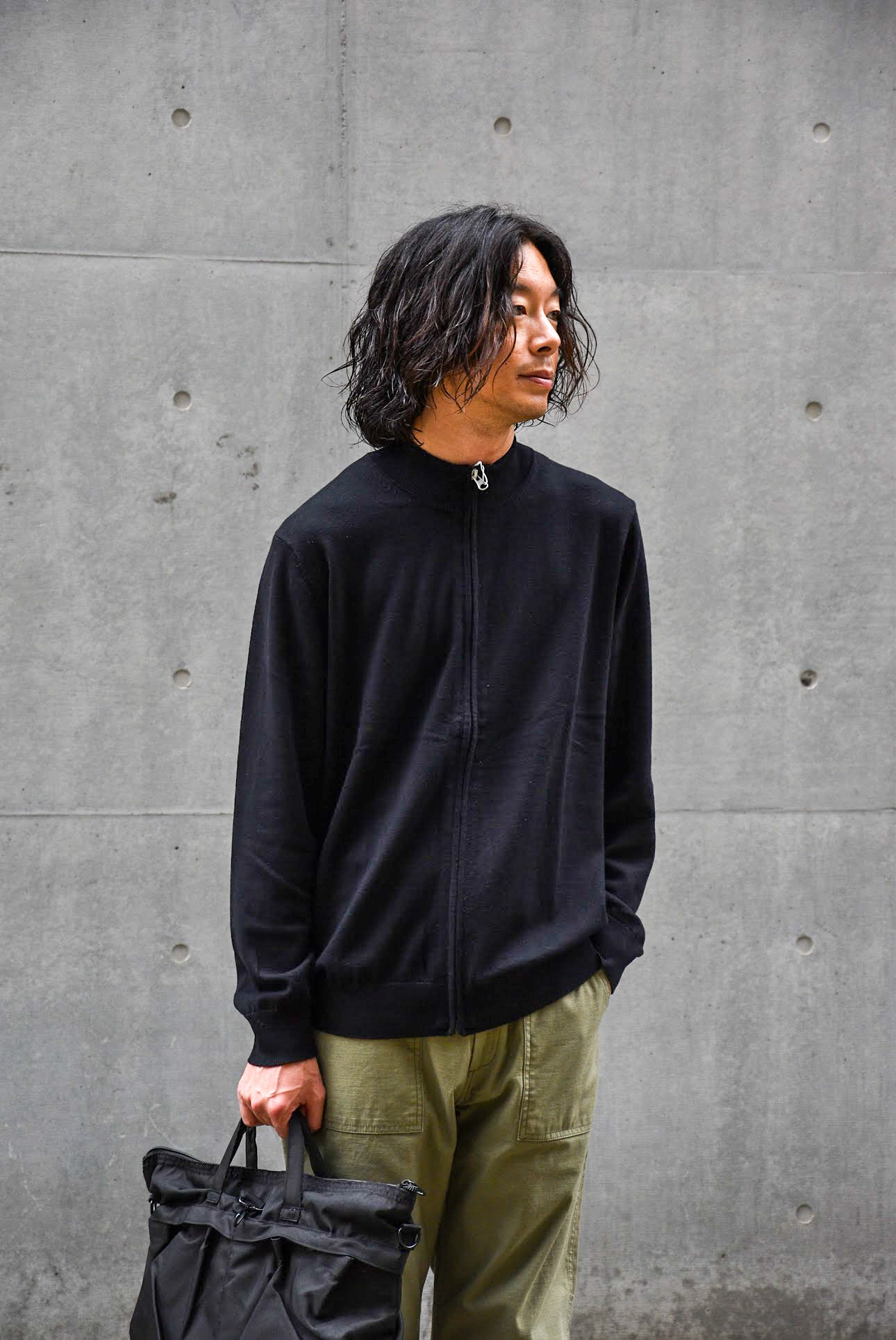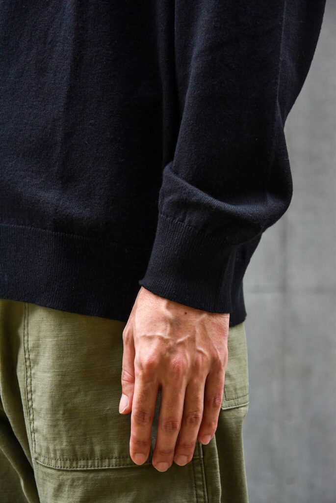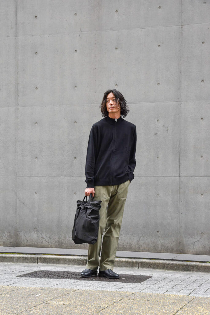 このテのジップアップニットはタートルネックくらいの高さで首をしっかり覆うものが多いですが、素材がコットンベースなのでモックネックくらいの高さの方が着る期間も長くなって良いですよね。