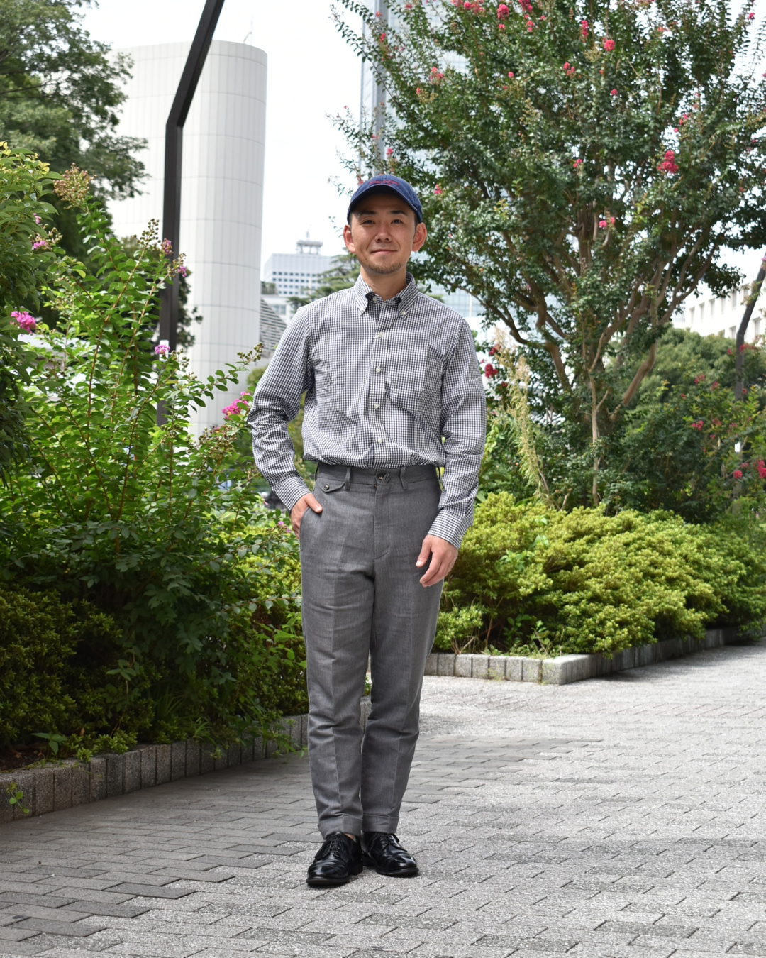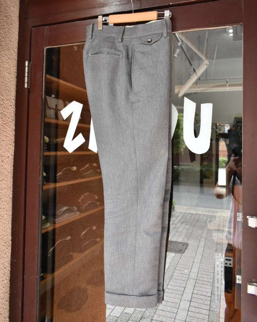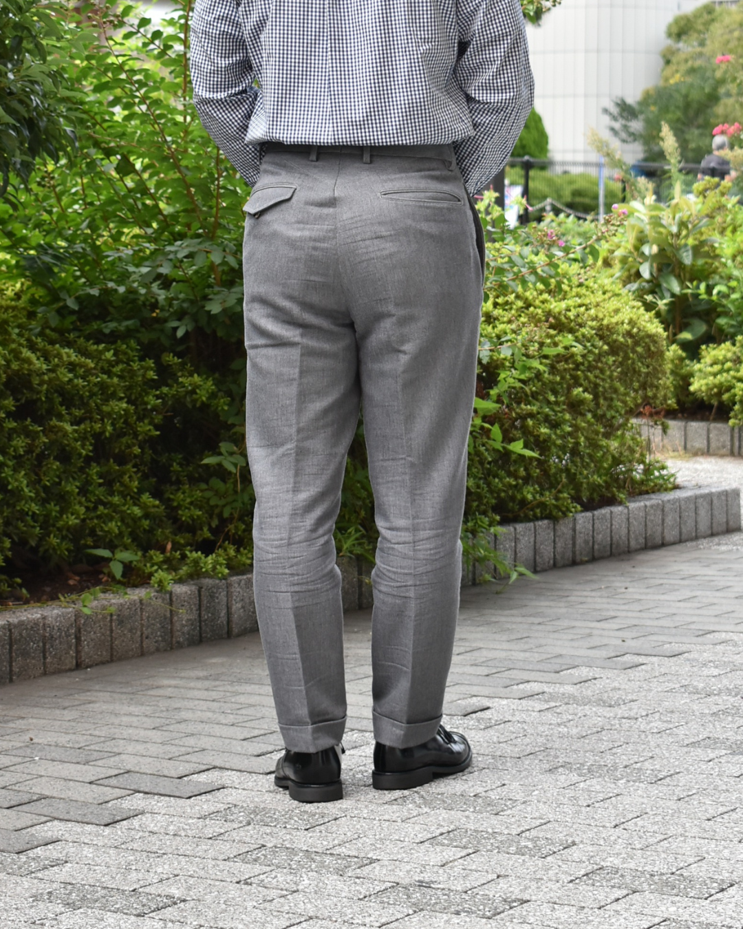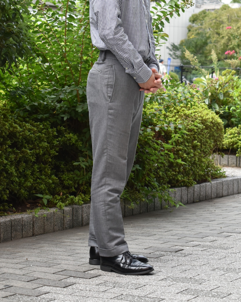 どこからどう見ても、誰が穿いててもシュッと綺麗なシルエットで品よく映るグレーのスラックス。