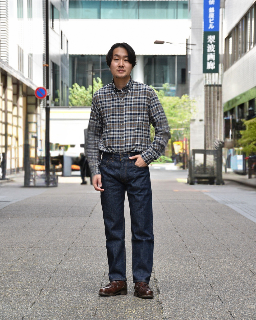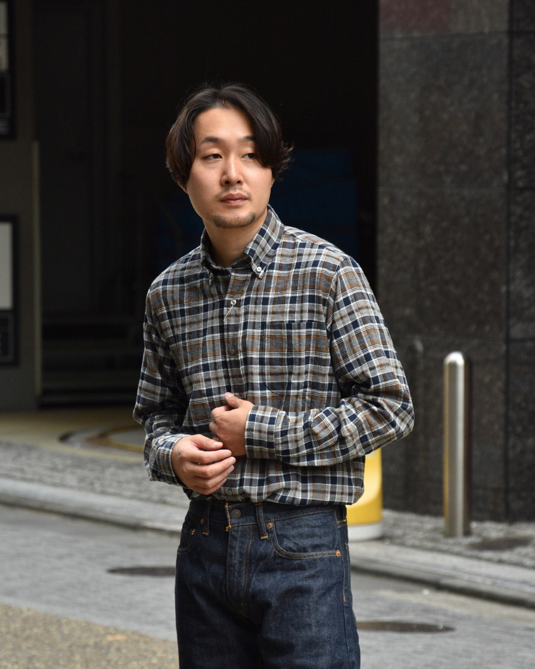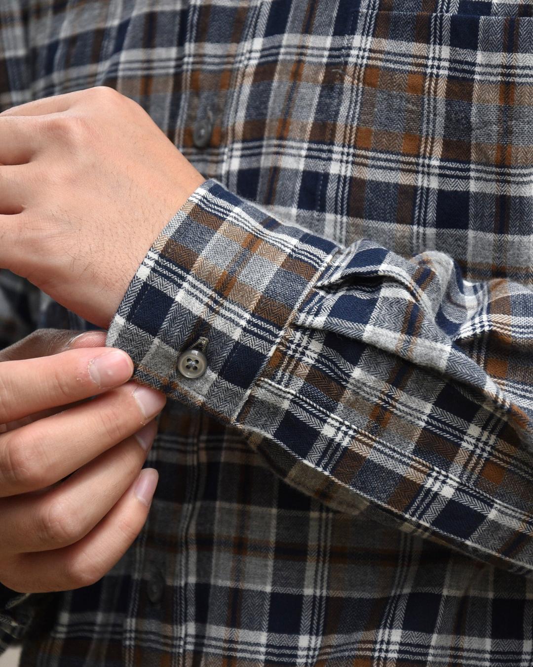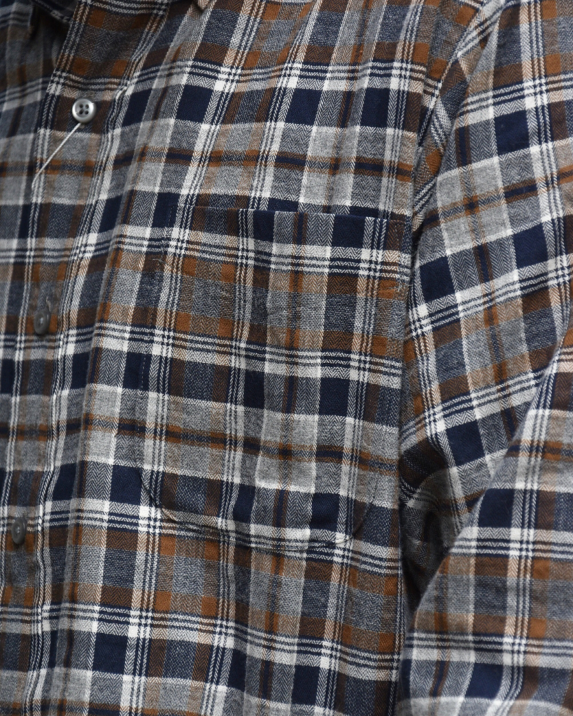 シャツとしてはやや大振りなタータンチェックですが、各色のコントラストを抑えることで悪目立ちしないようになっています。