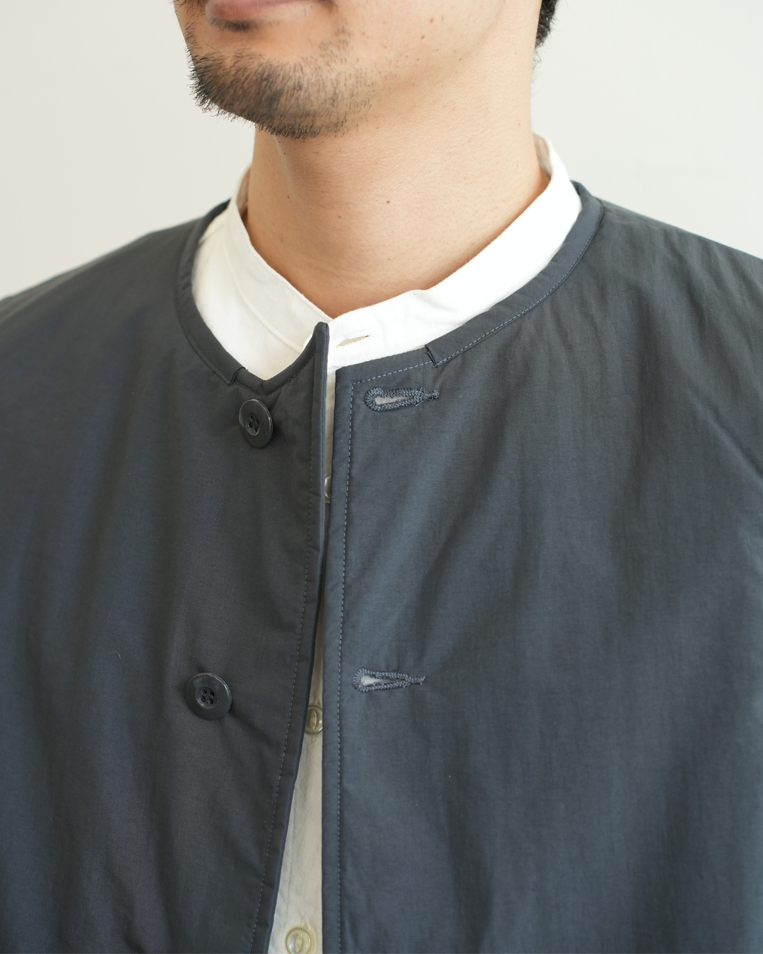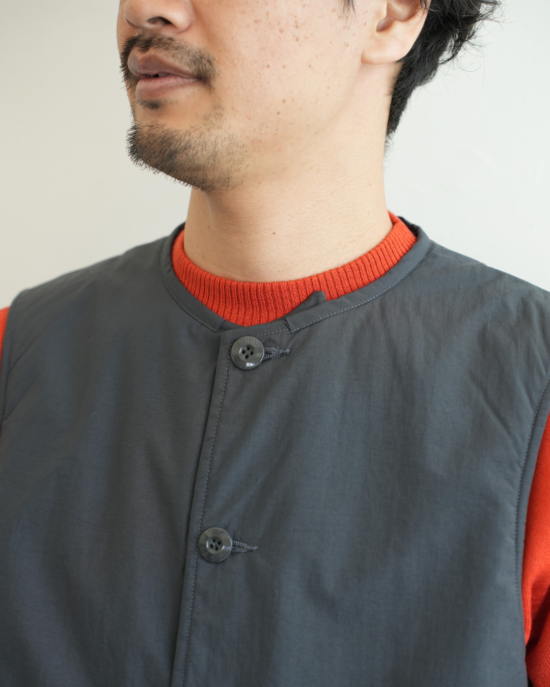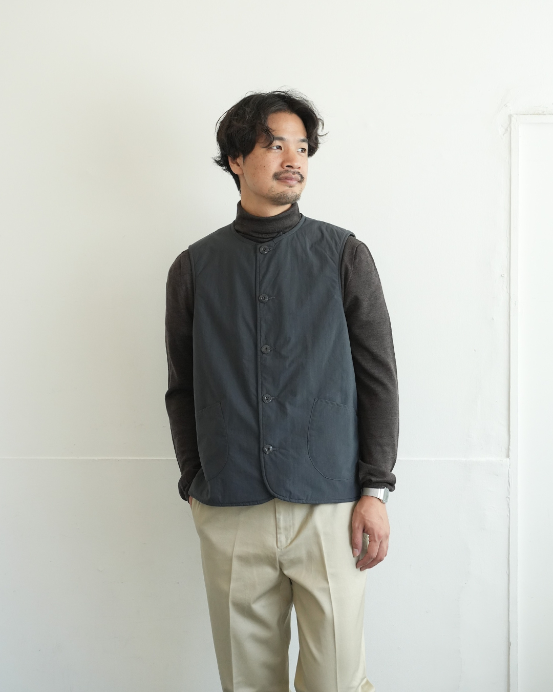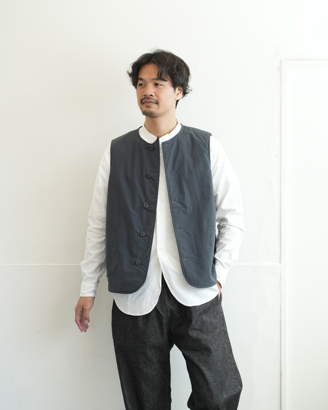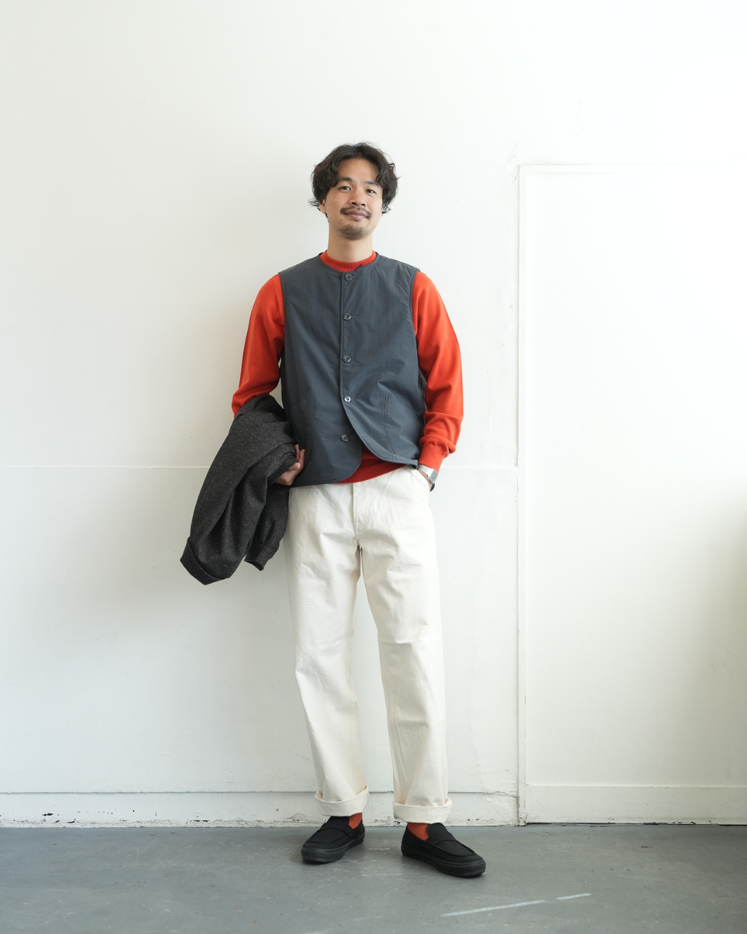 丸襟に合わせてバンドカラーシャツを合わせてみました。裾もラウンドしたシャツなのでベストの形状ともバランス良く、自然な重ね着が可能。パンツはブラックデニムで色は少なめに。