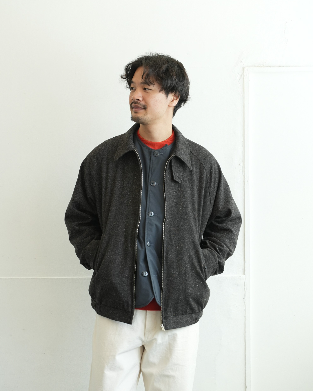 ツイードのハリントンジャケットを羽織って、冬のレイヤード完成。