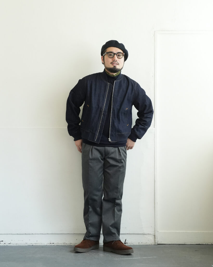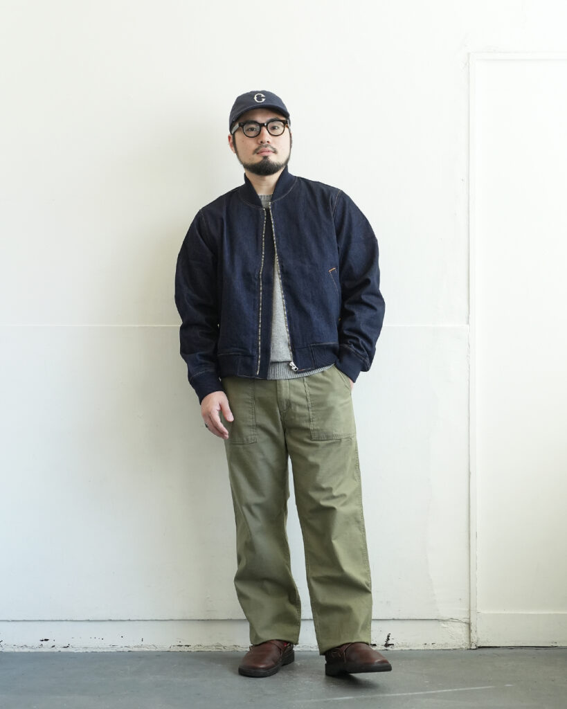 Gジャン×ベイカーみたいな見た目ですが、アウターのシルエットが変わればコーディネートの雰囲気も変わります。
