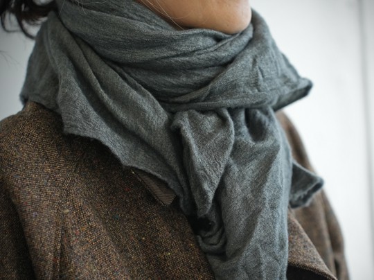 輪っか状になったいわゆるスヌード型。ここの巻き物は紹介した通り布帛ではなくニットですので、通常難しい3重巻きも伸びが出るおかげで可能です。