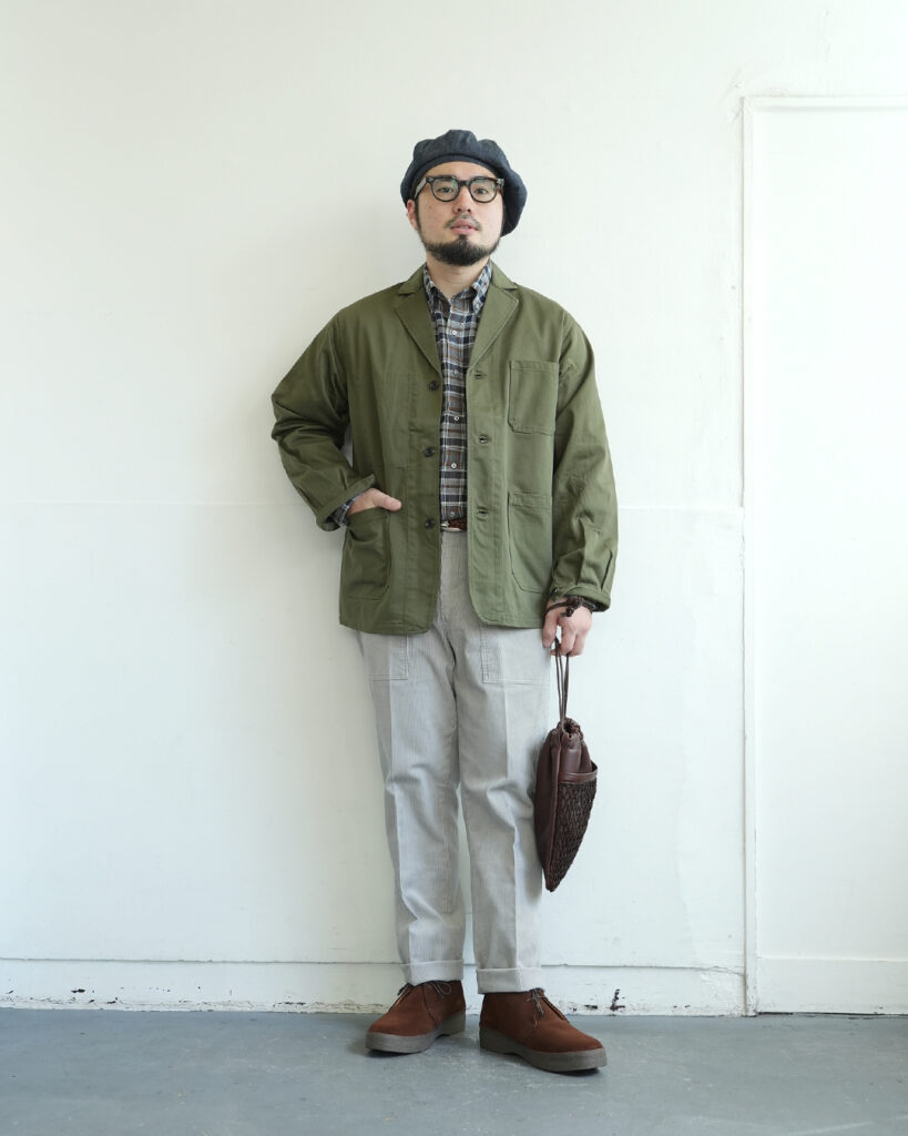 ハンティングカバーオールと合わせたコッテリな組み合わせもシルエットが綺麗なのでどこか上品に。