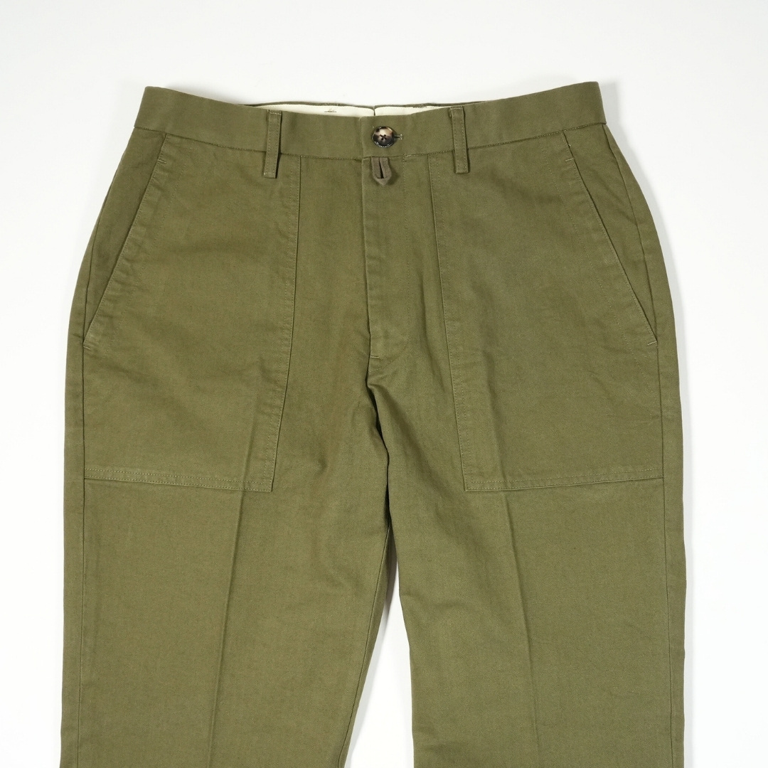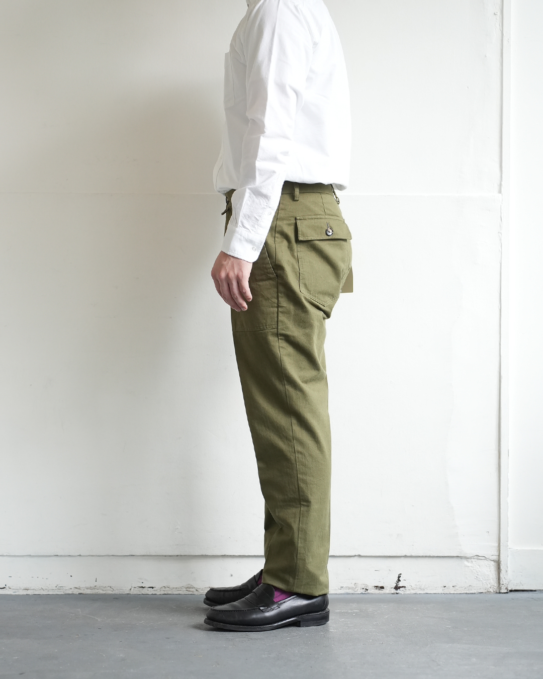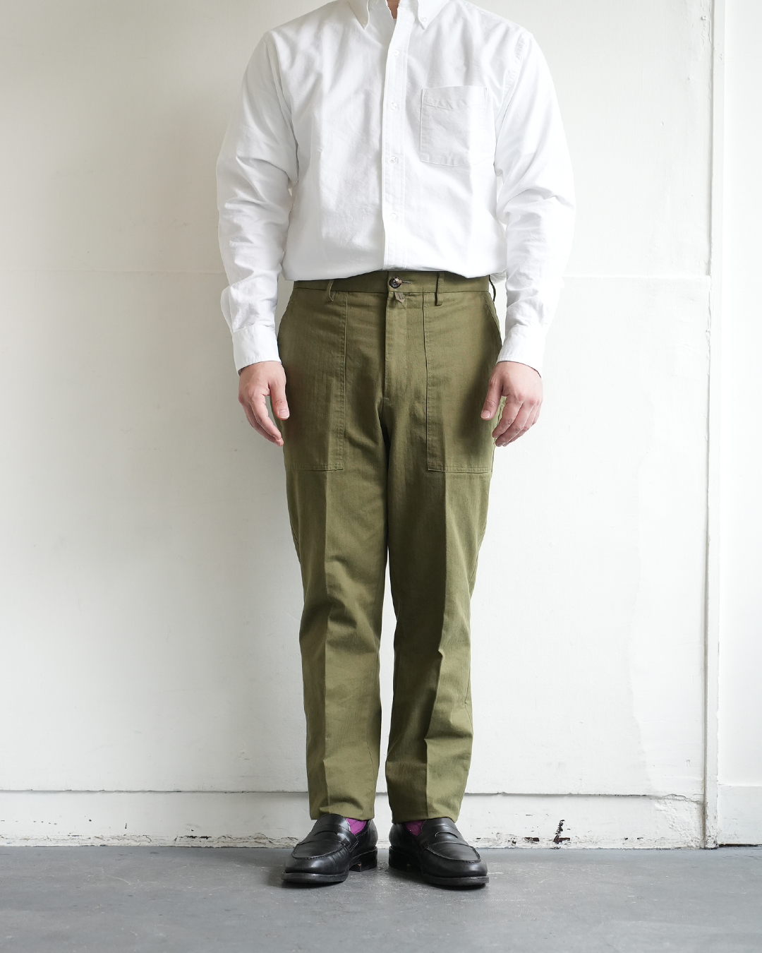 ファティーグ(=ベイカー)パンツにみられるフロントとバックに取り付けられた大きなパッチポケットが特徴的なデザインのこちら。