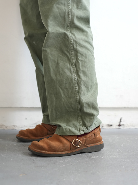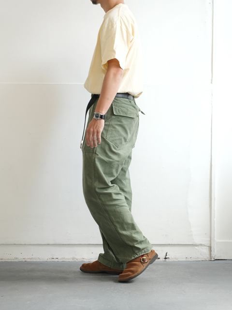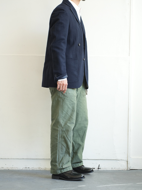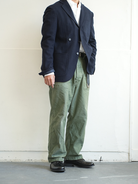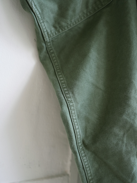 色目はガンホーグリーンとでも呼びましょうか。オリーブドラブよりも少し緑味が強く、本来は冬場の服装には軽く感じてしまいますが、生地のドライな質感も相まって、オールシーズン着用可能な一本となっております。