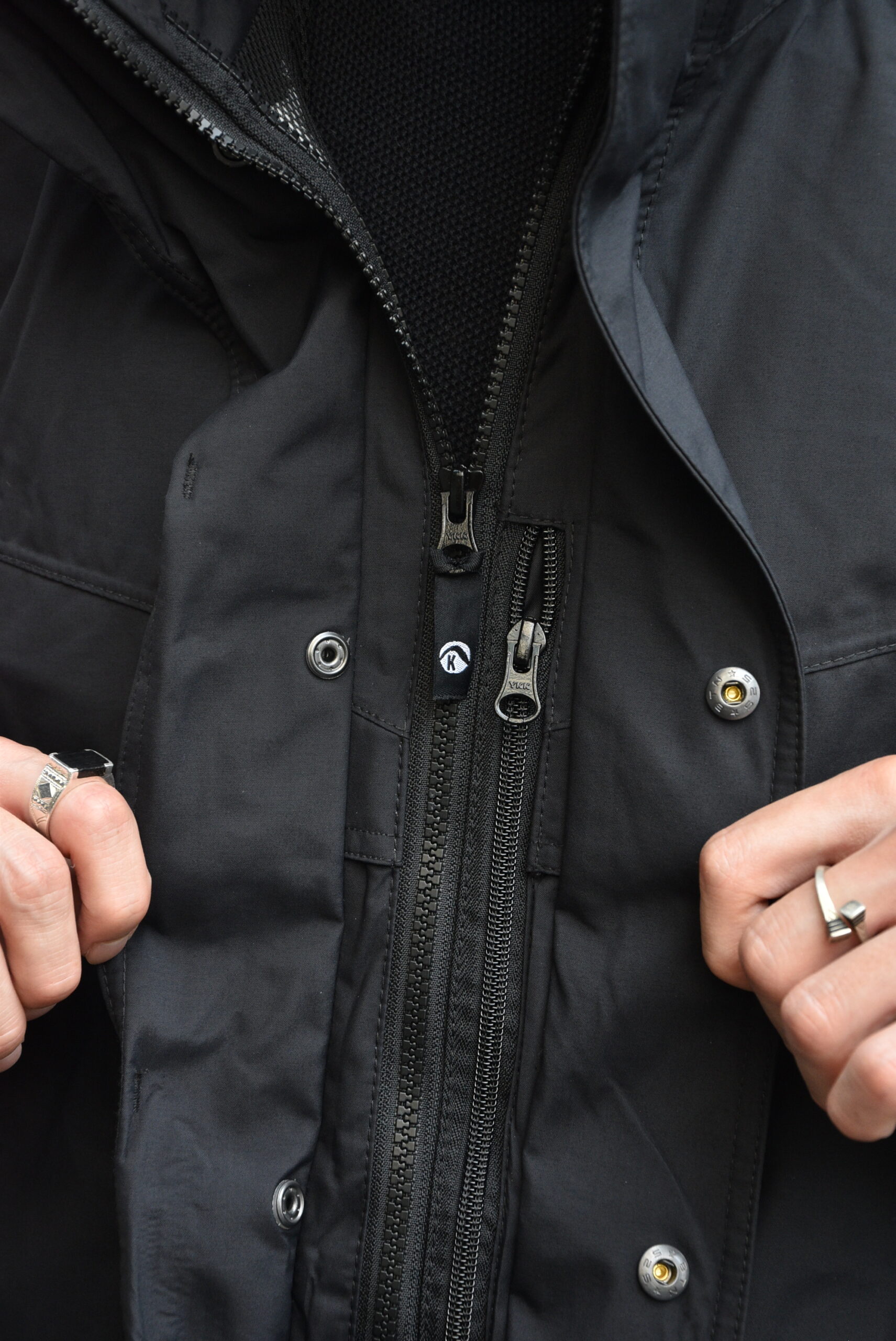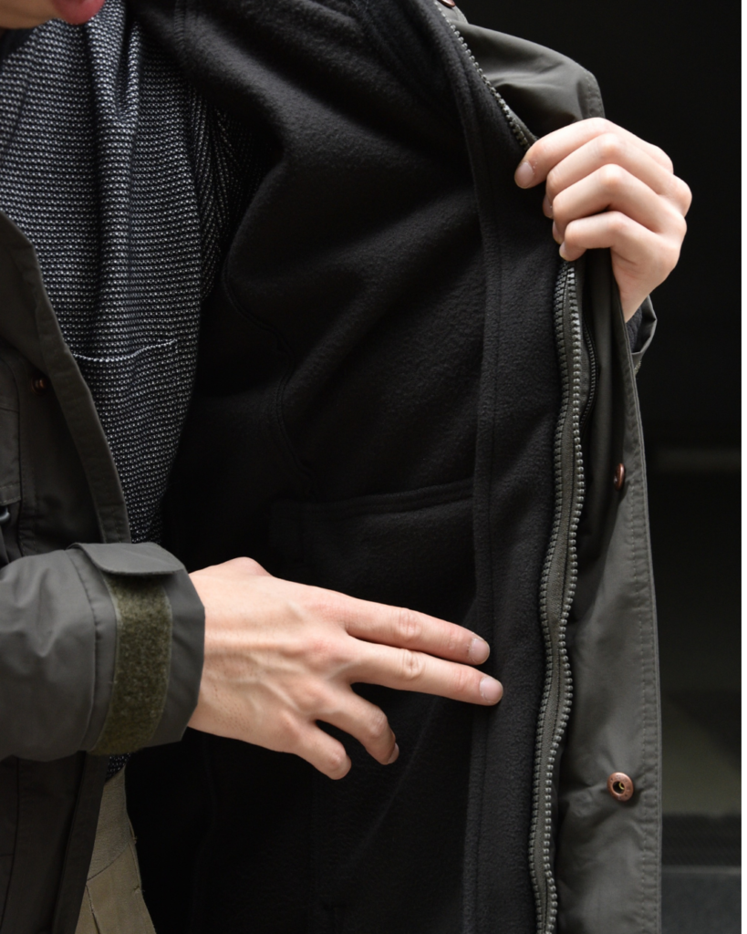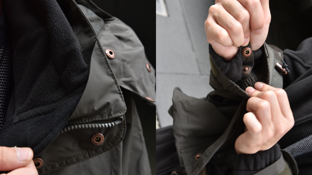 フロントは比翼仕立てのジップ+スナップボタン。ハンドウォーマーポケットを含む4ポケット構成。