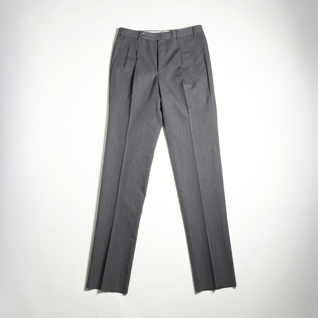 裾にかけてテーパードが効いたアウトプリーツテーパードスラックス。先ほどのモデルに比べると細目のスタイルにはなりますが、タックを入れることで、腰回りの程よいゆとりと脚のフォルムに自然に沿う、立体的なM字シルエットで真っすぐ落ちるプリーツ線が脚を長く綺麗に魅せます。