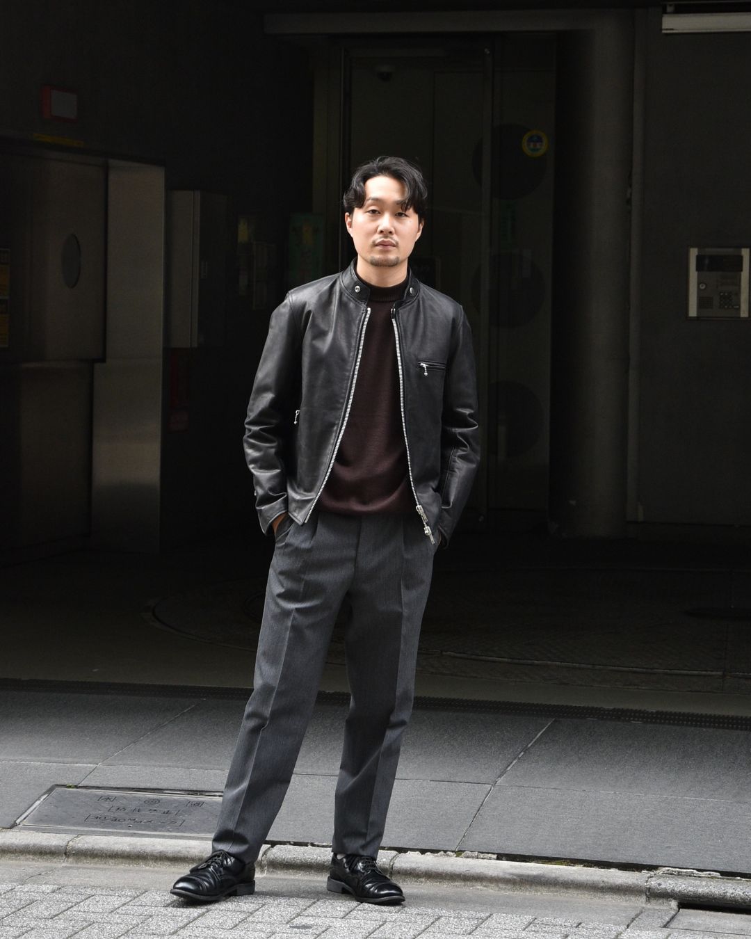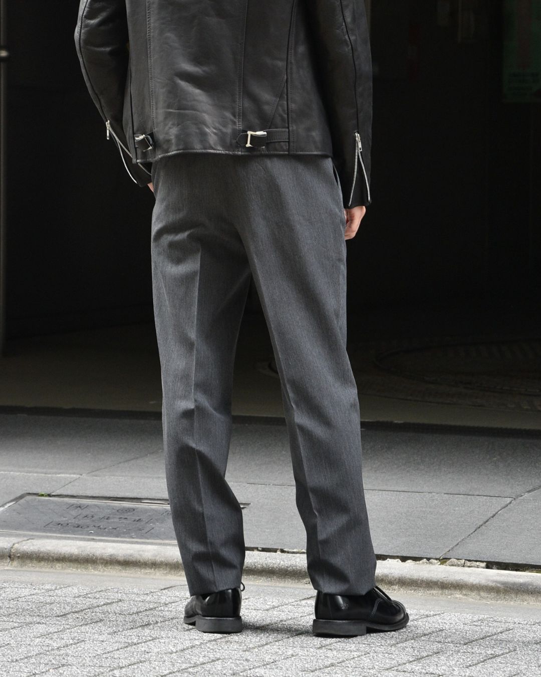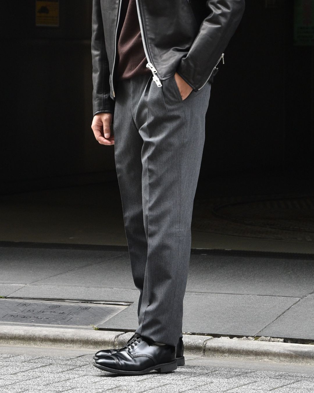 嫌味のない細さですので、革ジャンのようなスマートなアウターとも相性良いかと。