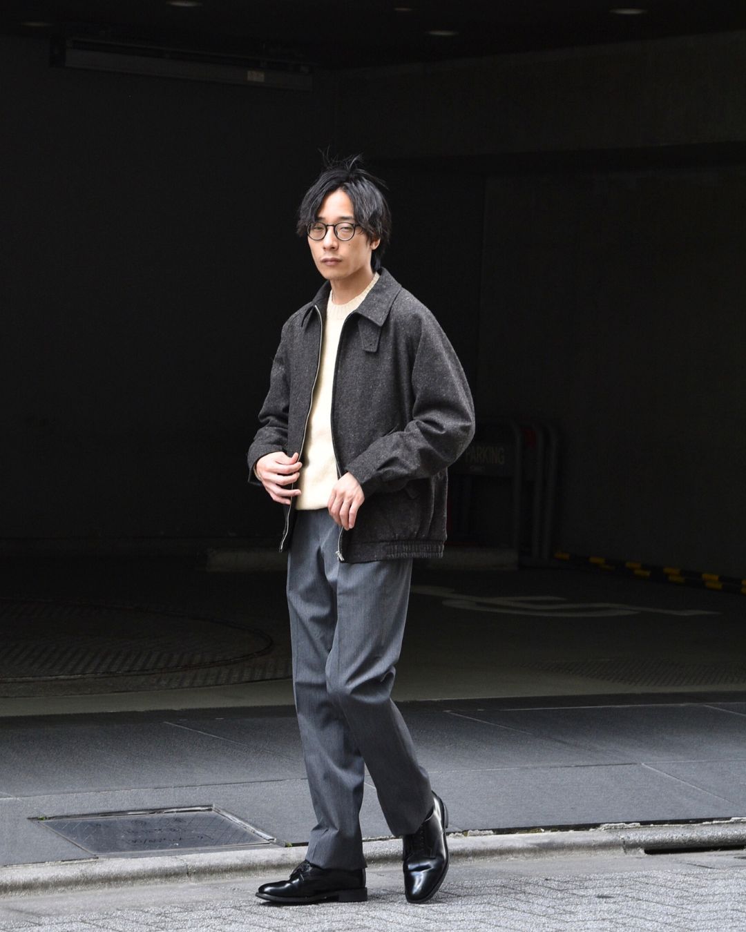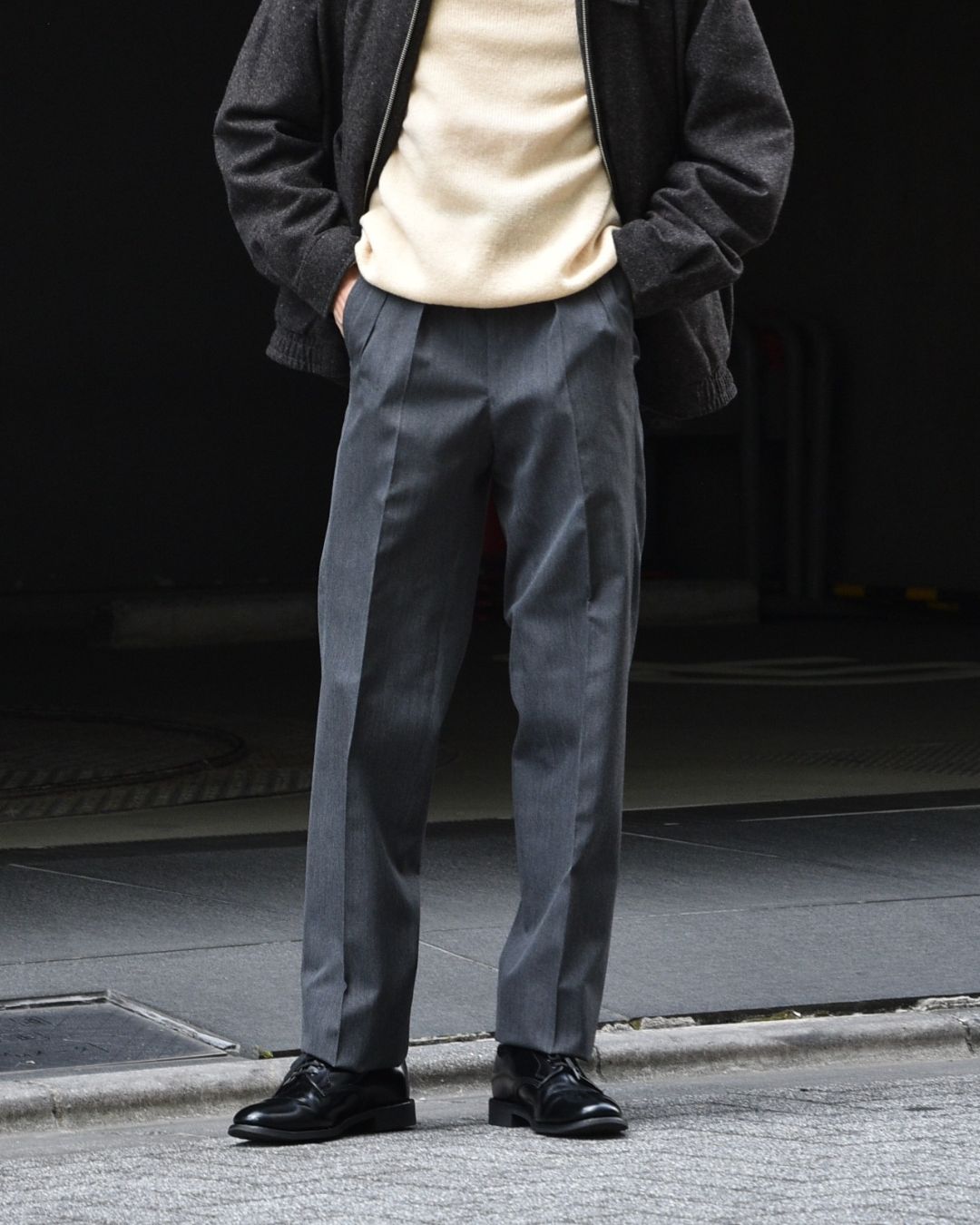 オフにも使いやすいグレーのトラウザー。シェットランドニットにウールのハリントンジャケットを合わせた、まさに大人カジュアルなスタイリングです。