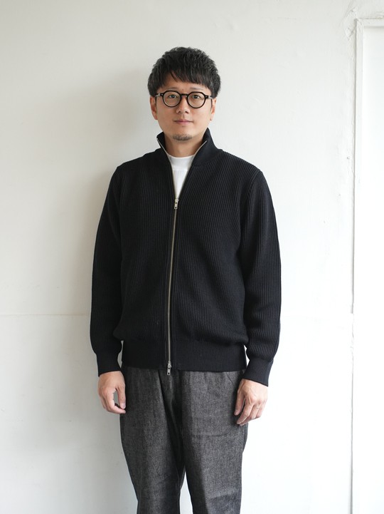 ウールの質感、黒のタッチ、そこに光るシルバーのジップ。とってもクールな一着です。