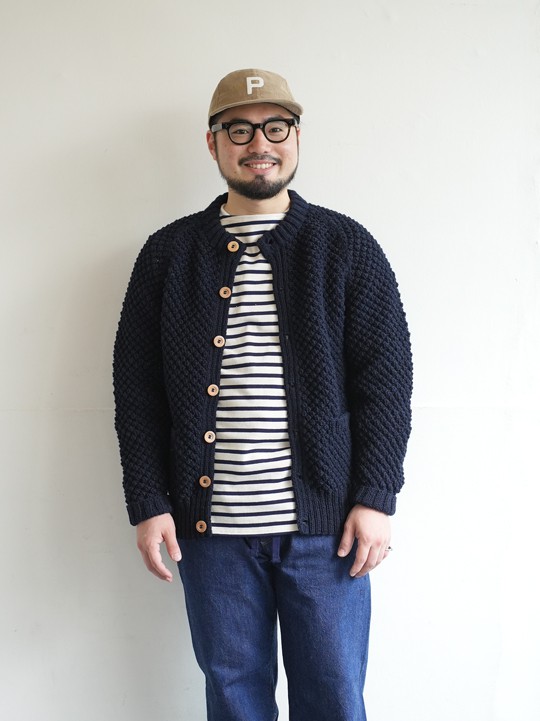 アラン編みのそれもとても良いですが、ZABOUではぽつぽつとした編み目が目立つポップコーン編みでオーダー。可愛さもほどほどに合わせやすいデザインです。