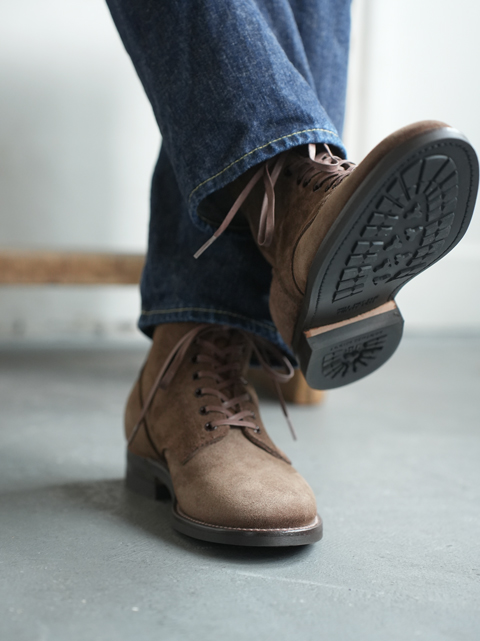 アッパーには中村千之助商店の吟付きスエードを使用。通常のスウェードよりも強度が高く、経年変化も楽しめる。