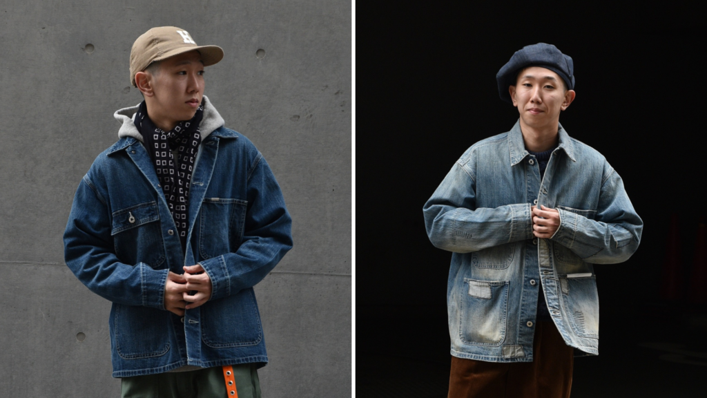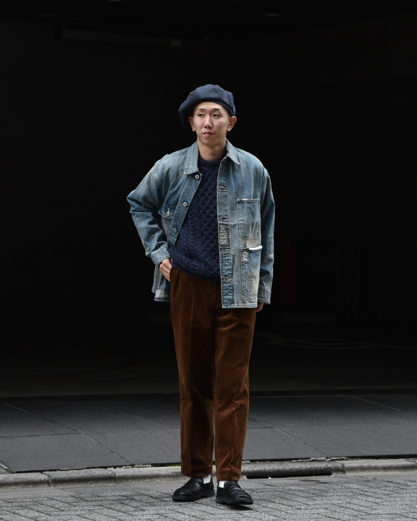 加工されたデニムのカバーオールには、最初から着る人に寄り添う雰囲気があります。