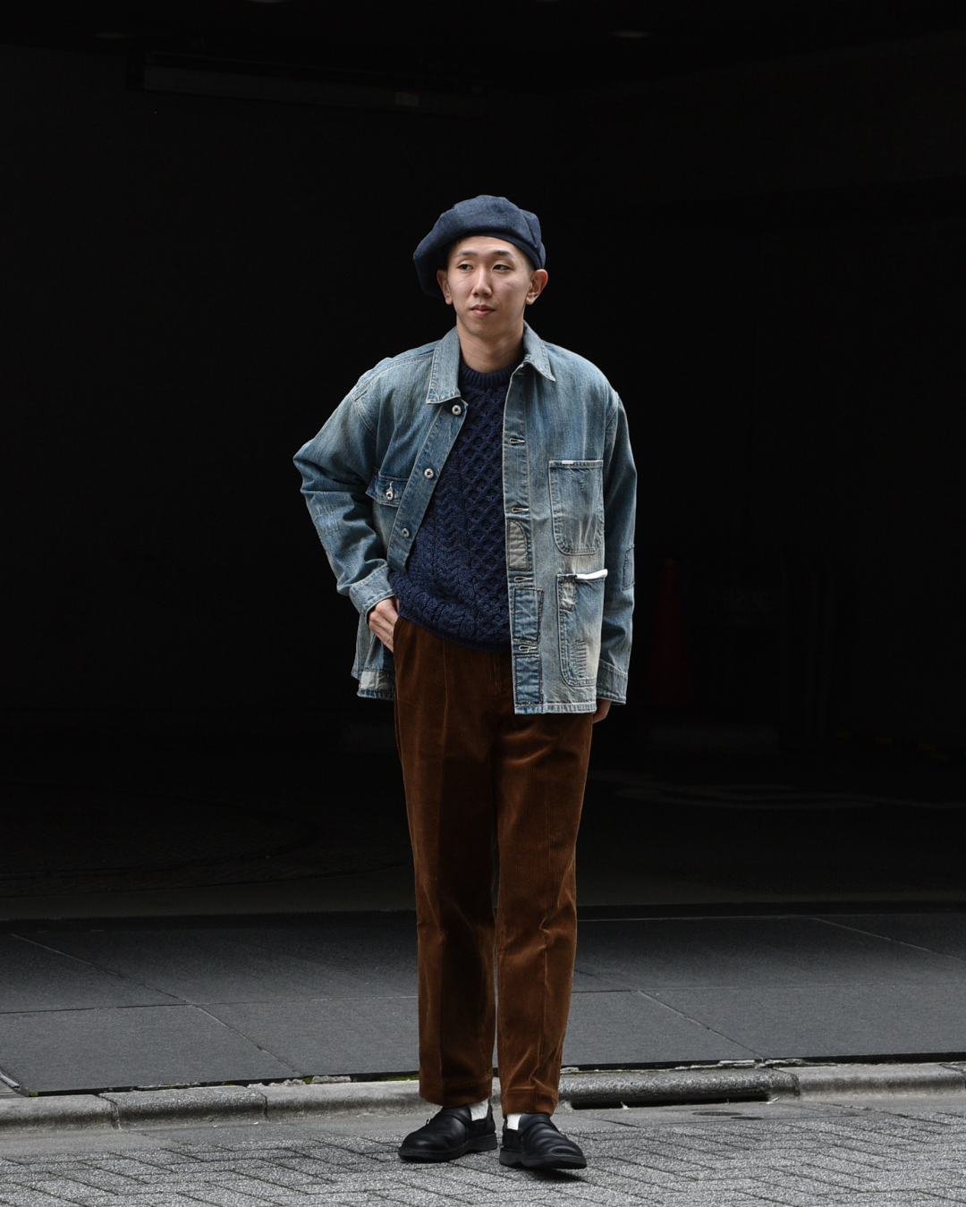 ワークの無骨さに陰影が加わり、ただの作業着ではなくファッションとしての存在感を強めてくれます。