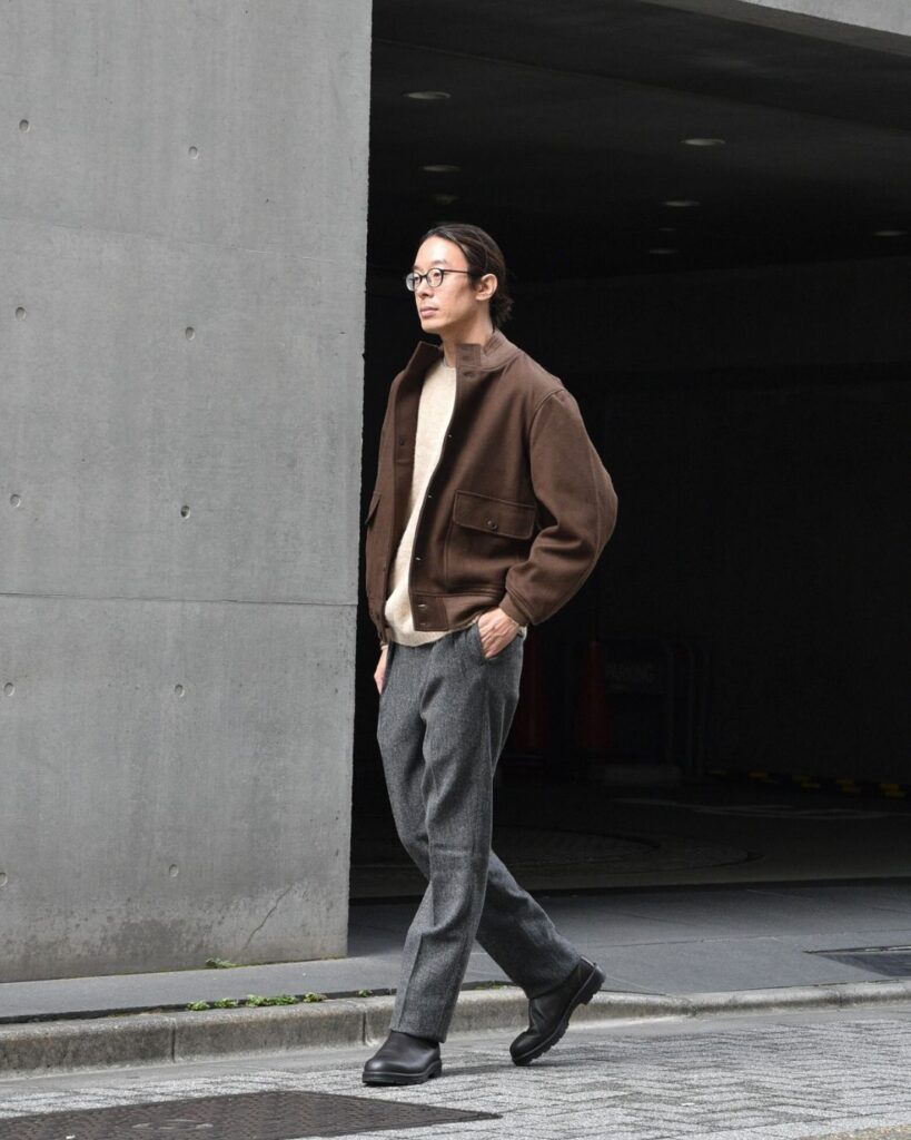 「そんなやわらかさがある俺にこのジャケットはピッタリなんだ。A1レザージャケットから着想を受けたデザイン。普通ならこれをレザーだと思うだろう。しかし、異なる。メルトン素材の柔らかさと軽さ。今の俺にはこの柔らかさと軽さが合う。」