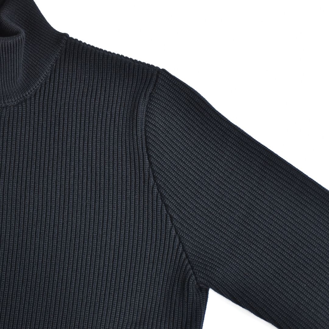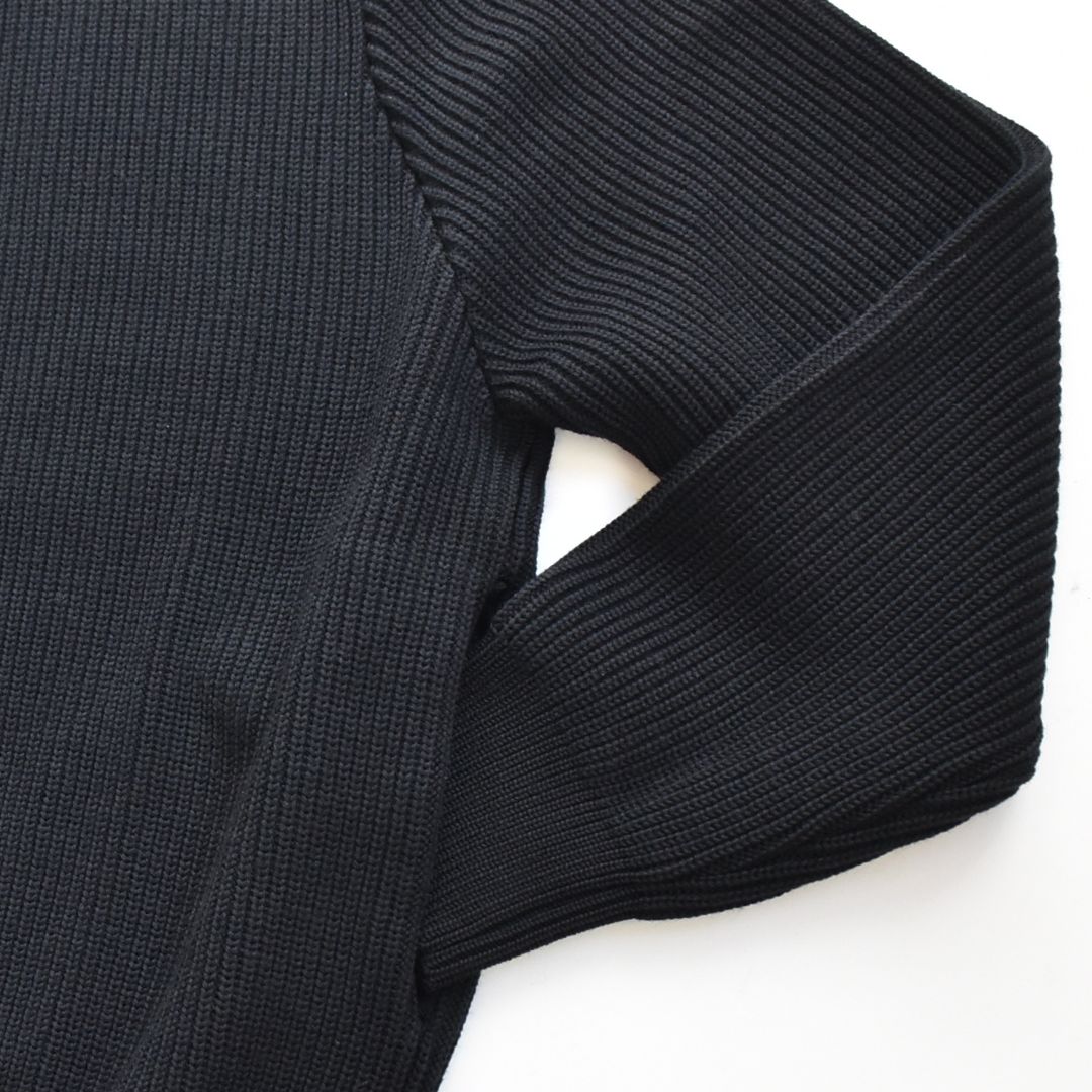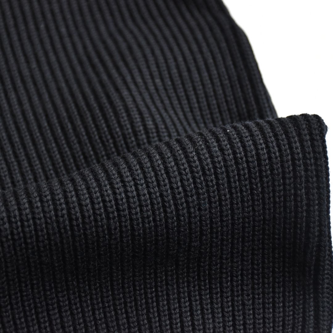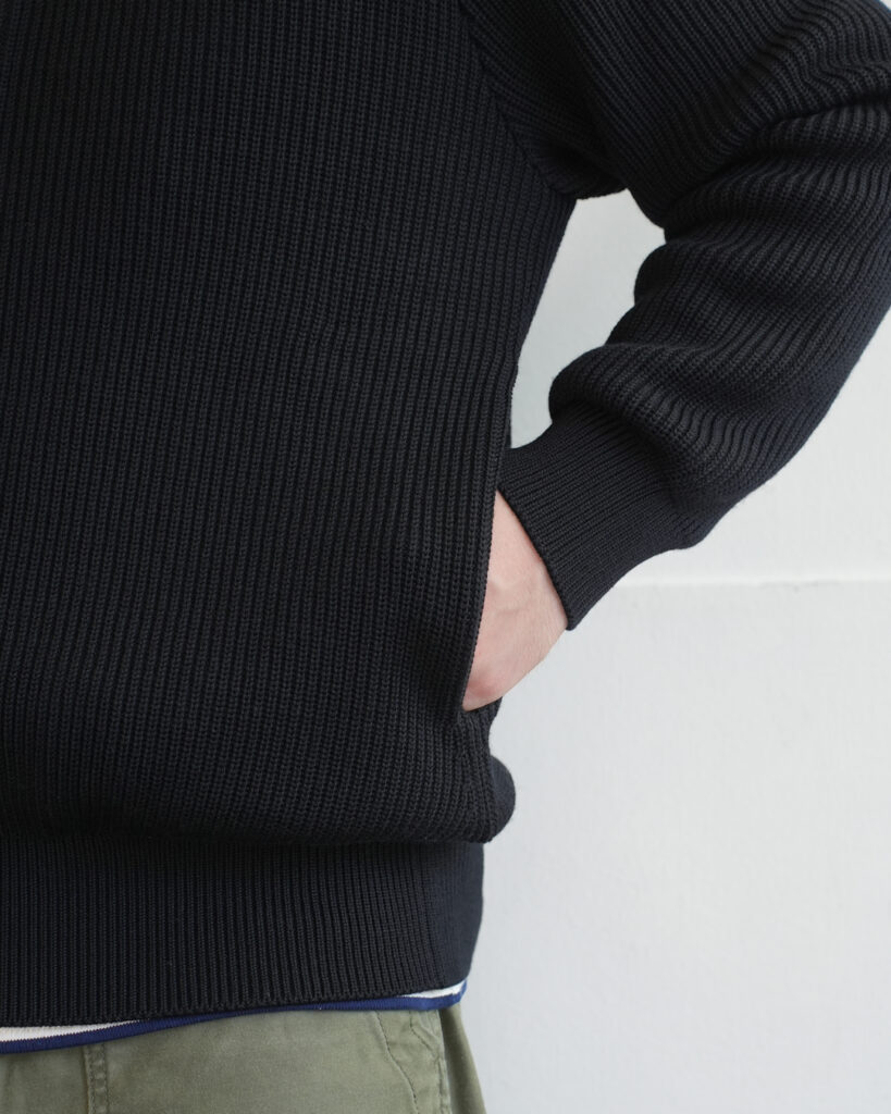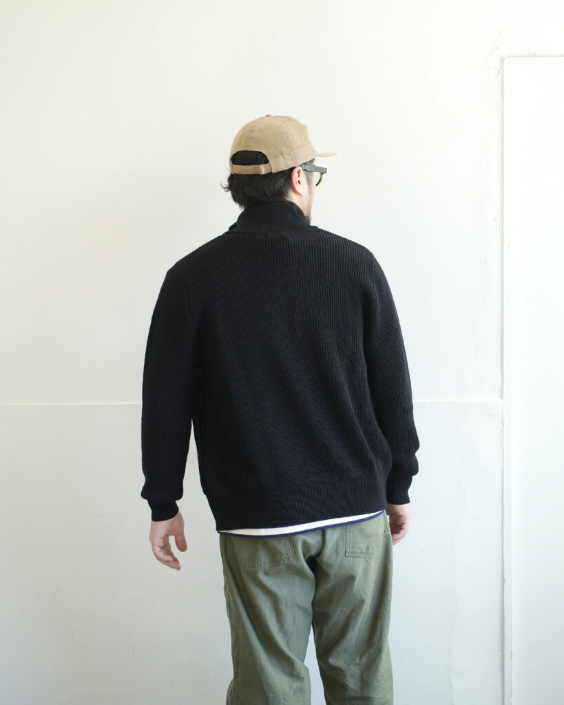 ドライバーズニットで重要な首回りの高さや適度な締め付け感はもちろん、裾・袖口のリブのやや強めのテンションによる着た時の丸みと立体感が出る綺麗なシルエットとなります。