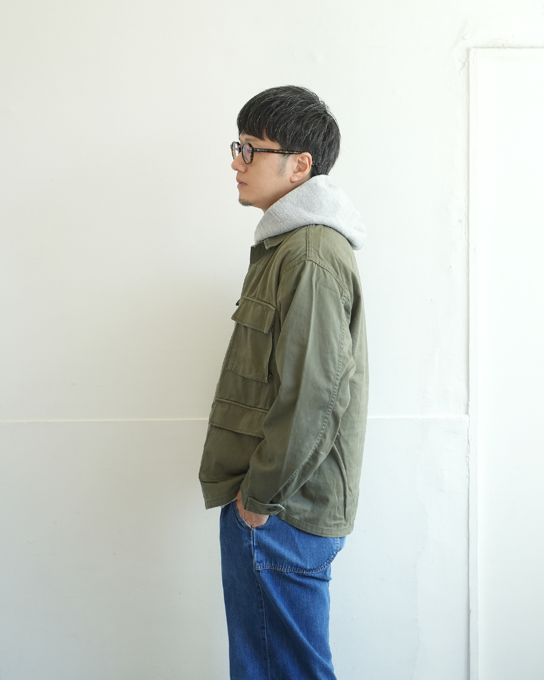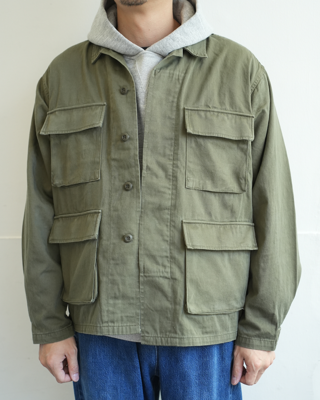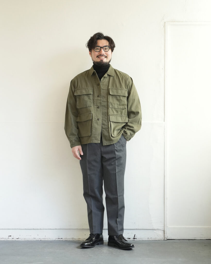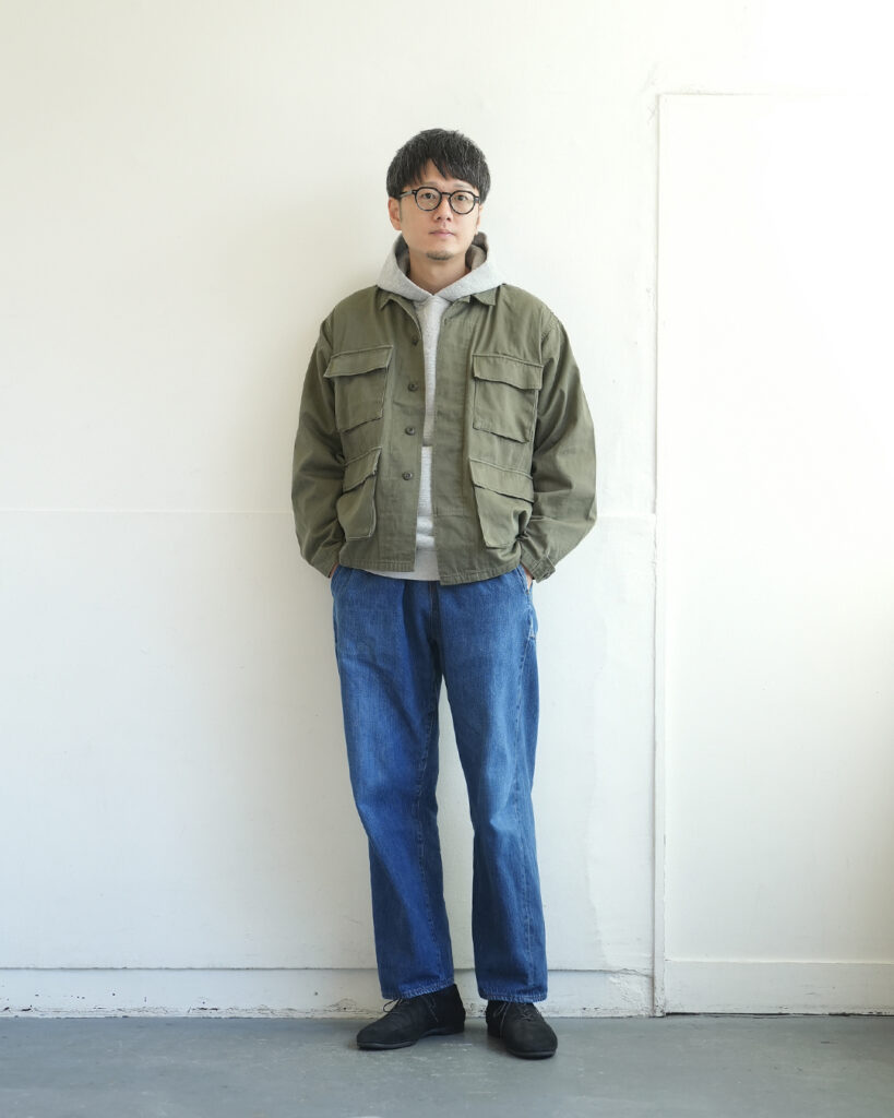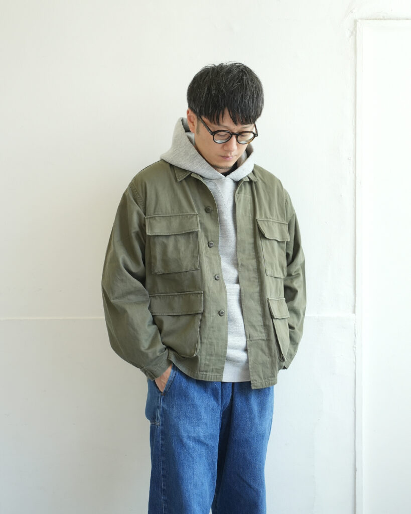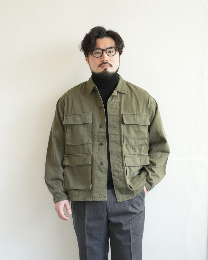 ミリタリー由来のファティーグジャケットをベースに、短めの着丈と、ややゆったりめの身幅に設定した1着。