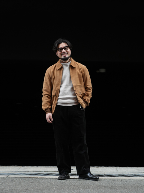 秋冬の濃色系のボトムス、特にブラックやディープインディゴのデニムなどにマッチするサンドスウェード。自身もこの使い勝手の良さから、普段からよく取り入れます。