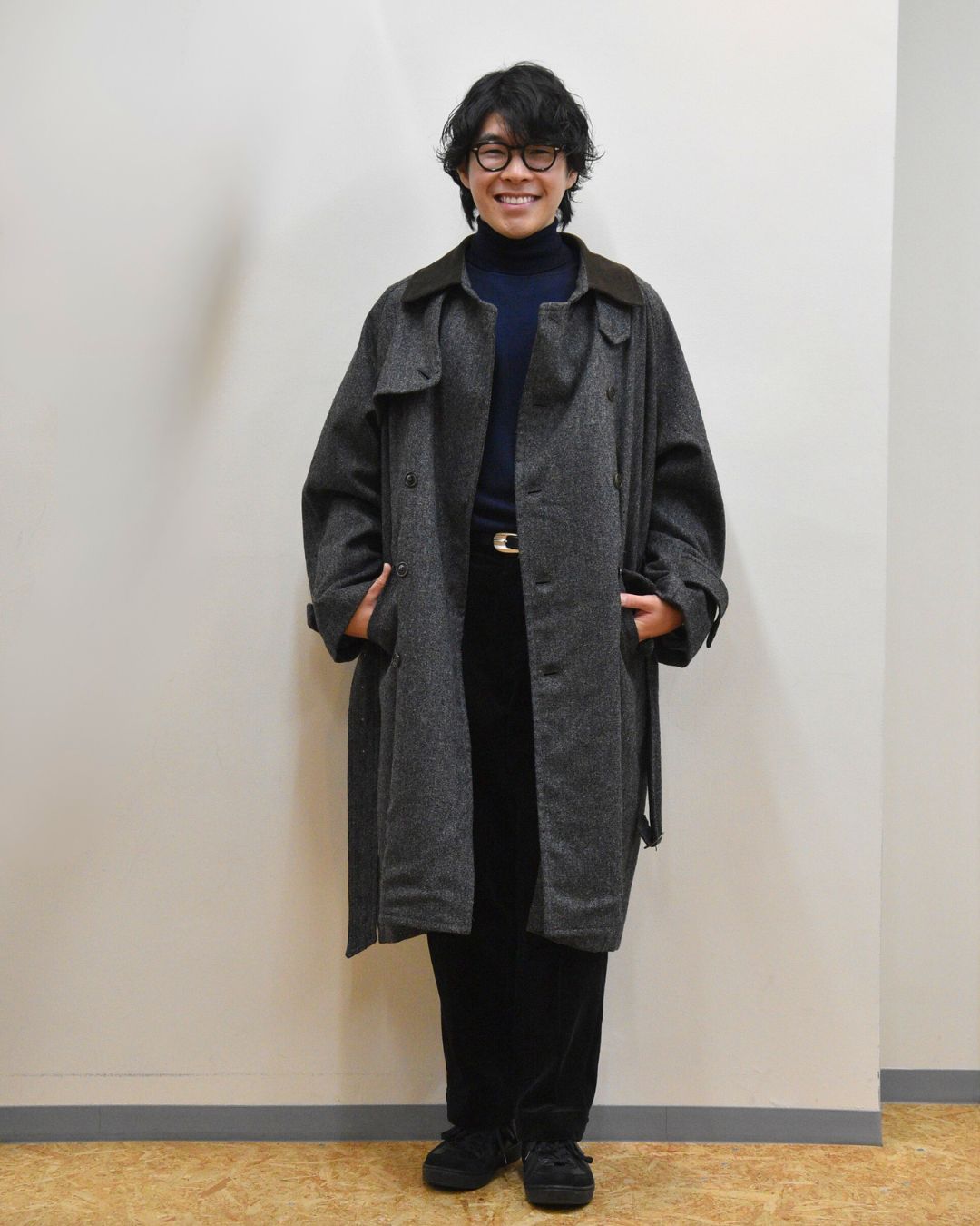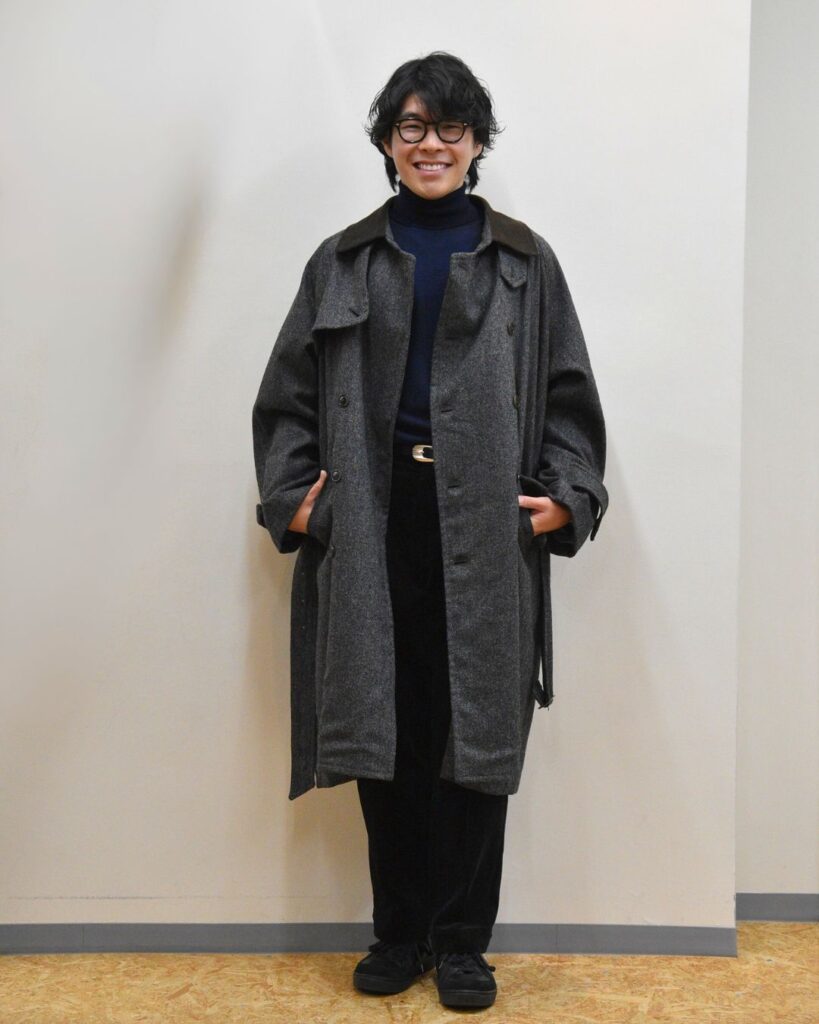 コートの柔らかなドレープとトラウザーのしっかりとした素材感が相性◎
