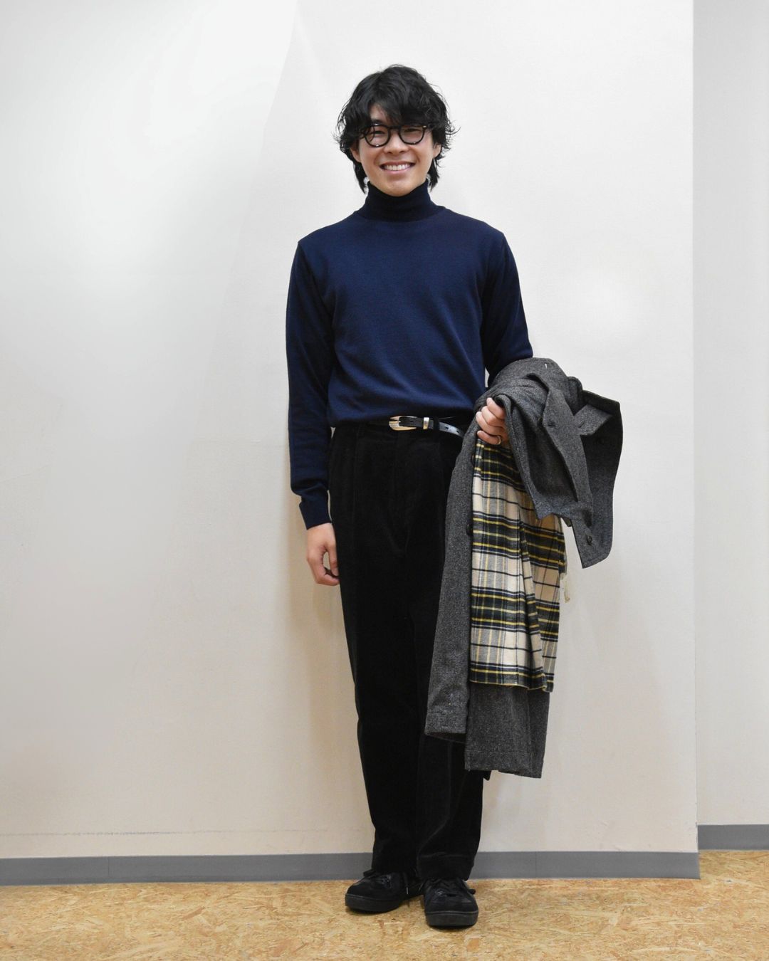 ブラックのパンツが全体を引き締め、ネイビーのタートルが落ち着いた印象を添えています。