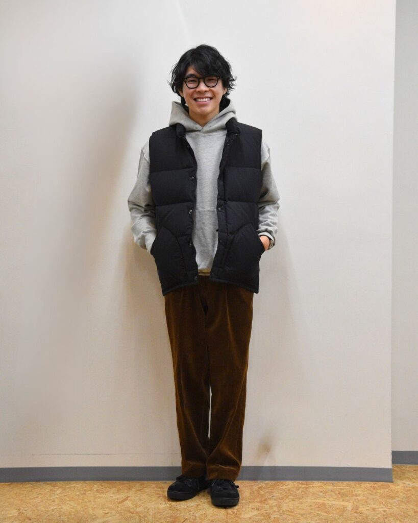 上にダウンベストを重ねることで、保温性を確保しつつ動きやすく、街歩きにもアウトドアにも対応できる万能スタイルに。