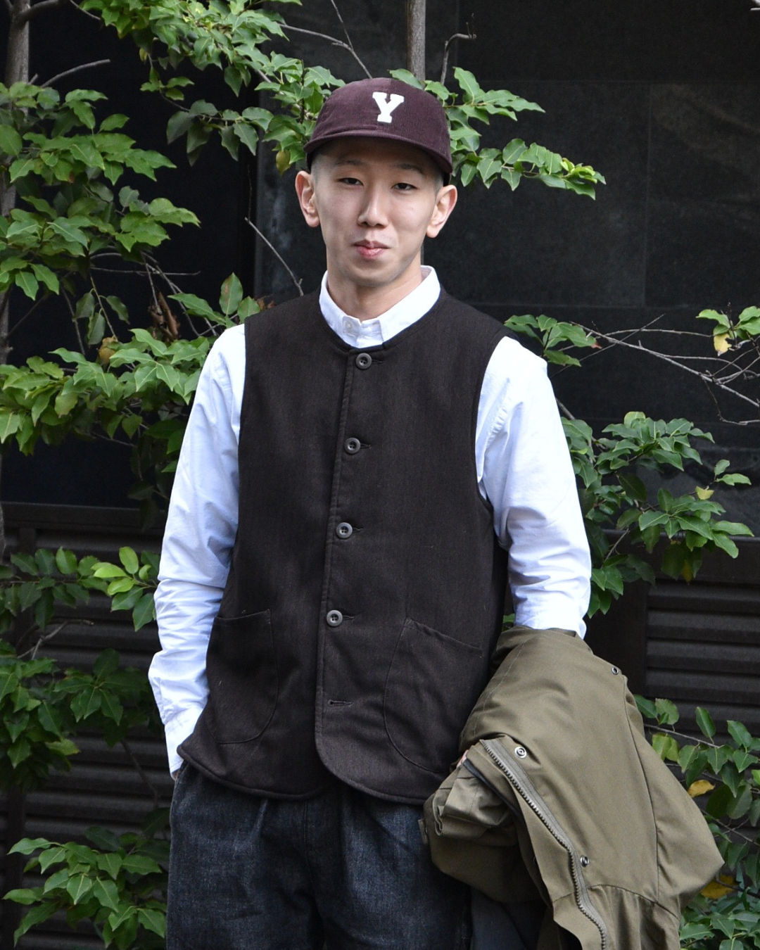 「まずはシャツONベストのオーソドックスなカサネギ。ARANのベストはクルーネックな仕様だからシャツと合わせた時丸みを帯びていてかわいい。アウターを脱いでも良い見え方をするんだ...