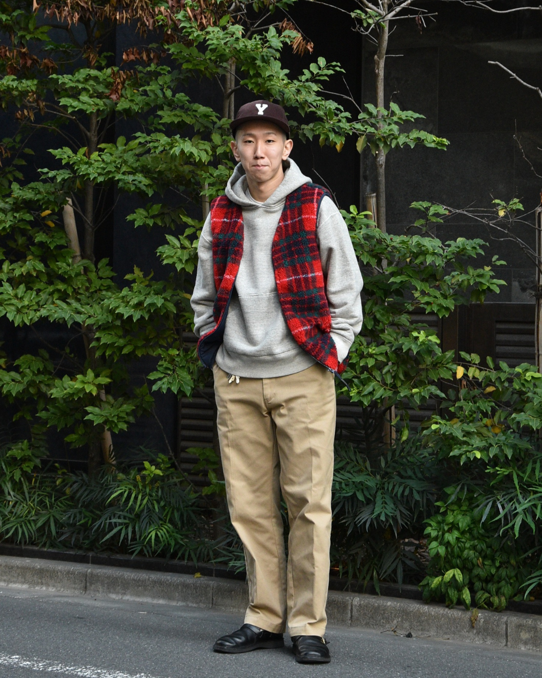 「最後にこの最高にエキサイティングなベスト。グレーパーカー×チノの鉄板の合わせに華やかさを添えてくれるなんともナイスなバラクータのベスト。もちろんもっと主張の強いアイテムの上にこのベストをカサネる非常に筋肉質なお合わせも良いが、まずはシンプルでスタンダードな方から行こう。」