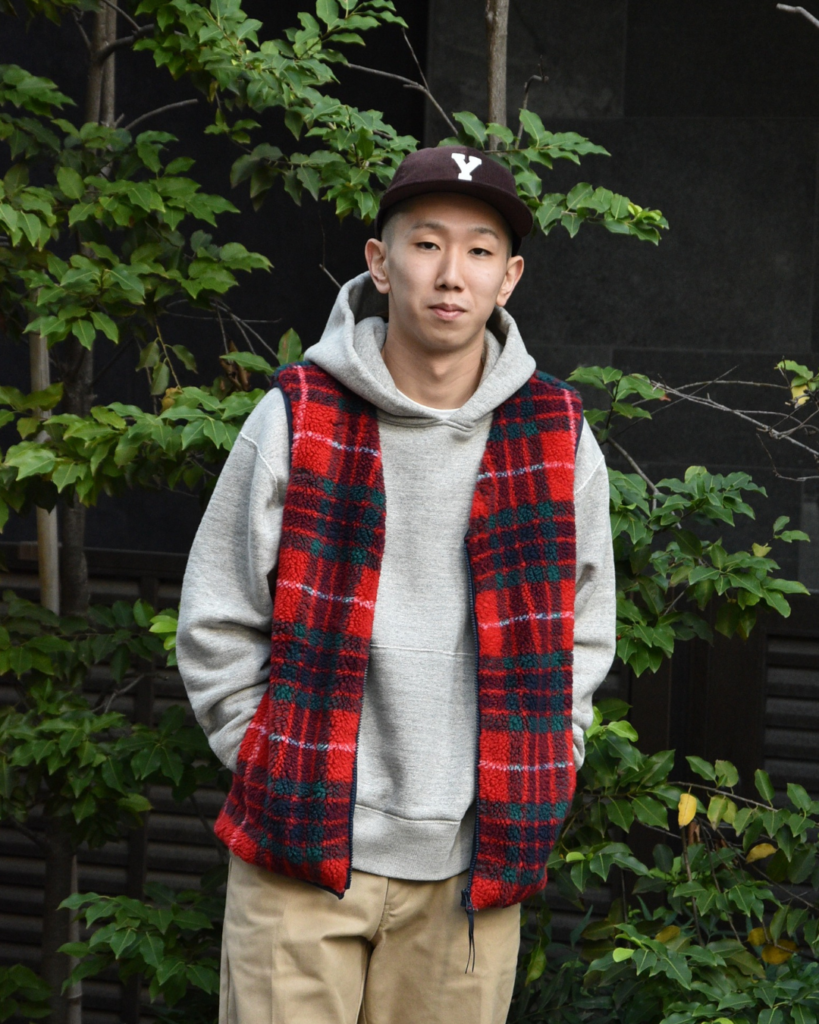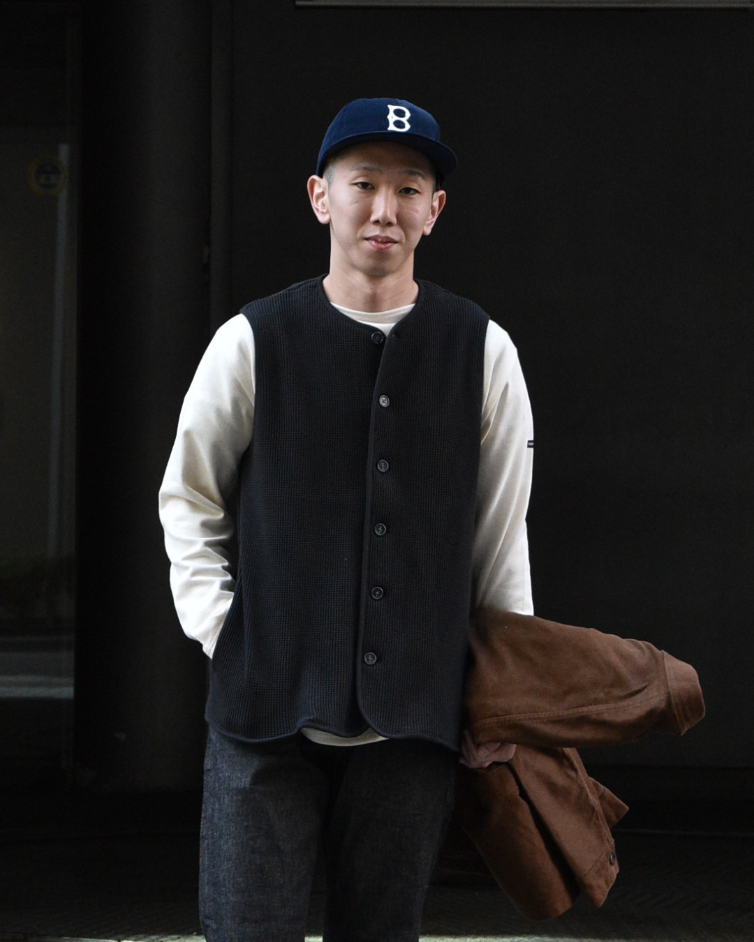 「身幅にゆとりがあるから、インナーはBARNSのワイドのスウェットパーカー。非常にバランスが取れていて、良い。このカサネギをした時のバランス感も重要だ。あとはベストが一番上にくる合わせは今時期しかしにくいから、今のうちにやっておきたいよね。」