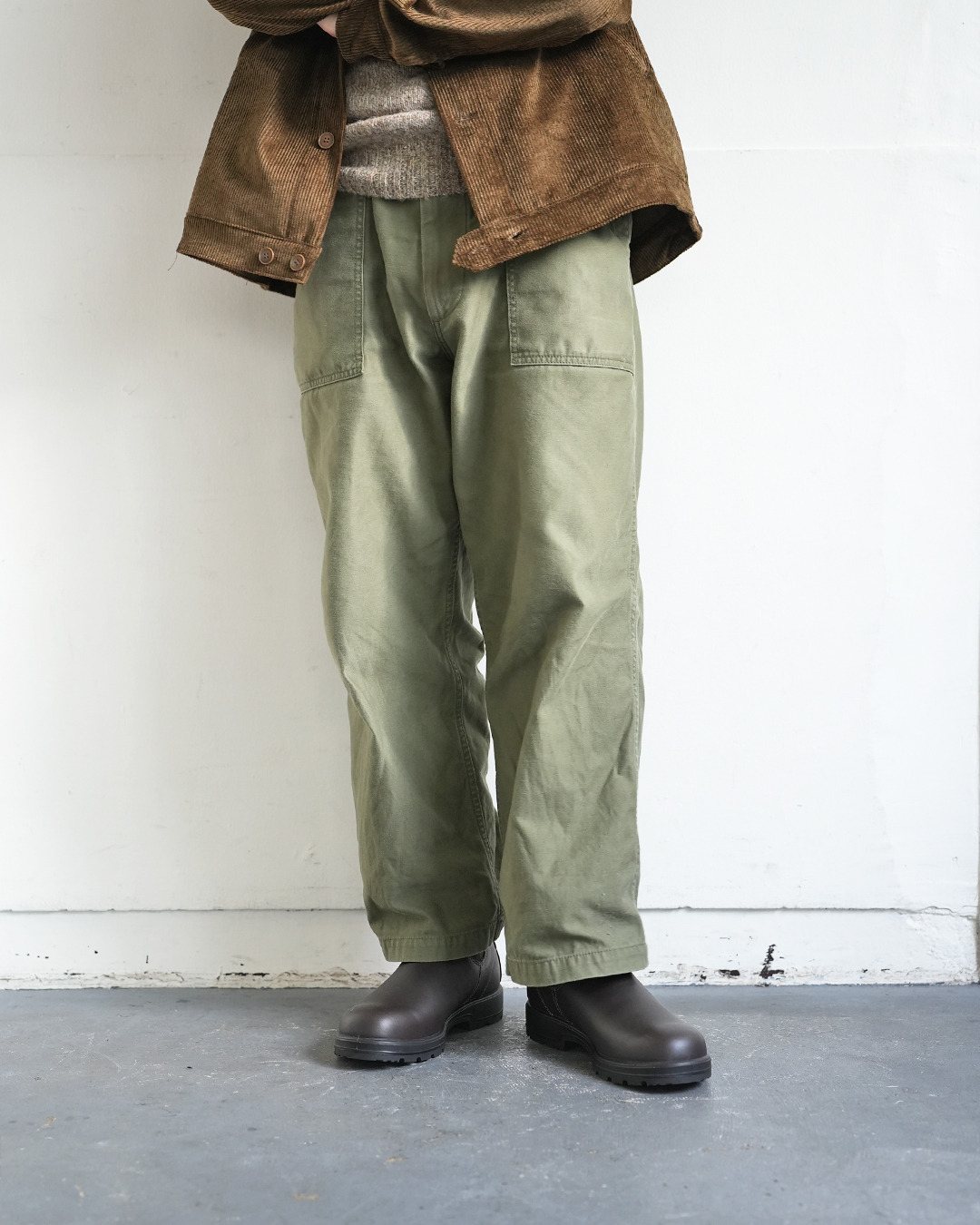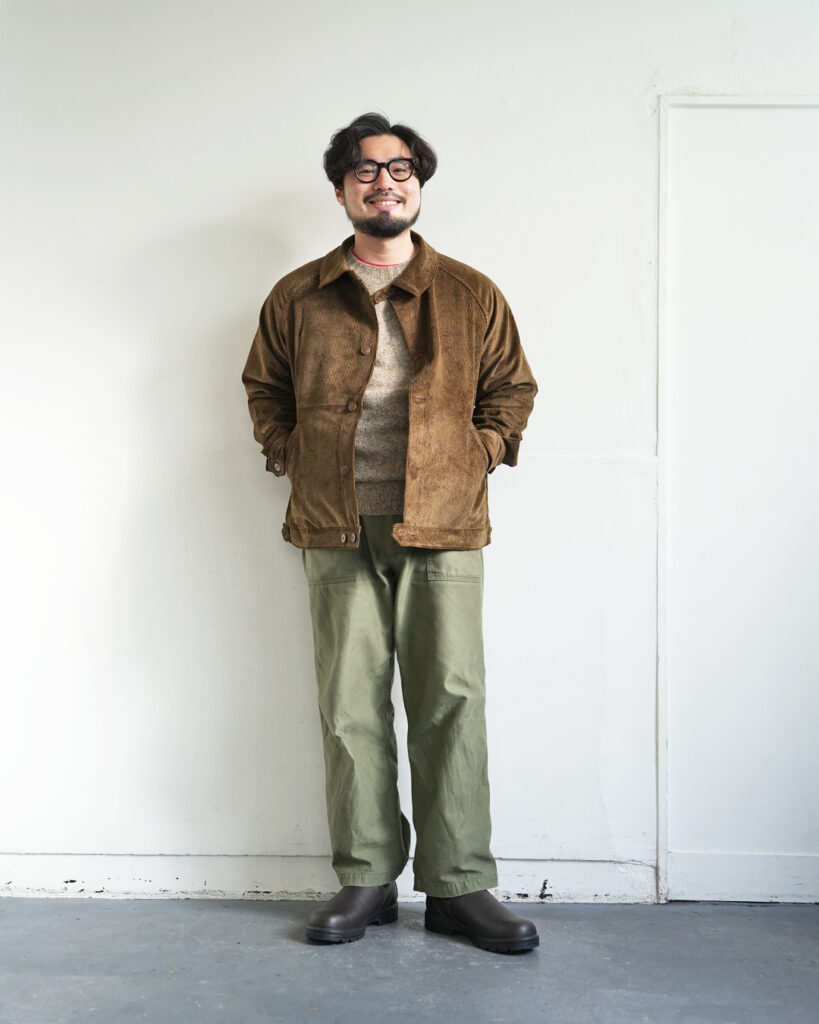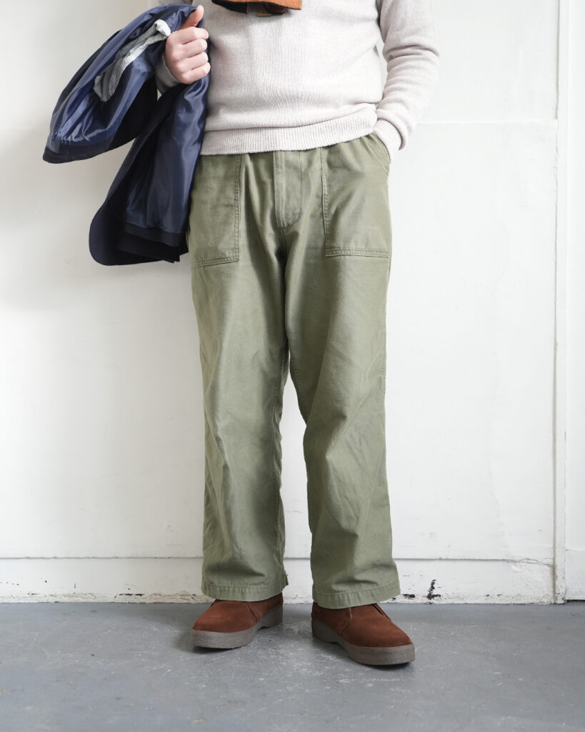ミリタリーの太さがほどよく抜けを作ってくれるので、カチッとしすぎず、でもジャケットでほんのり大人っぽく。