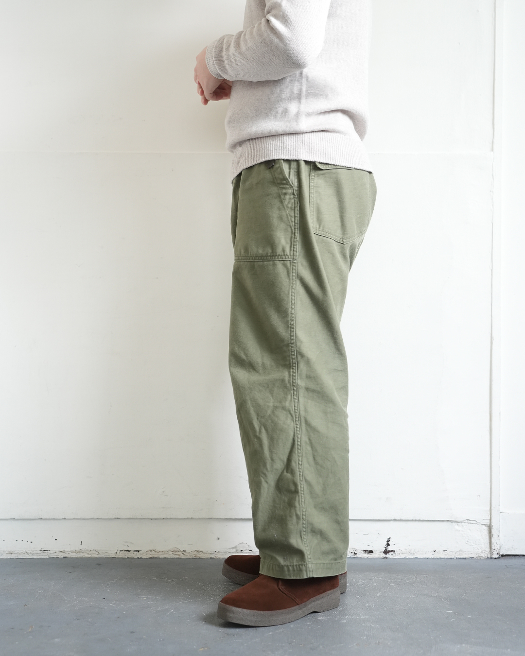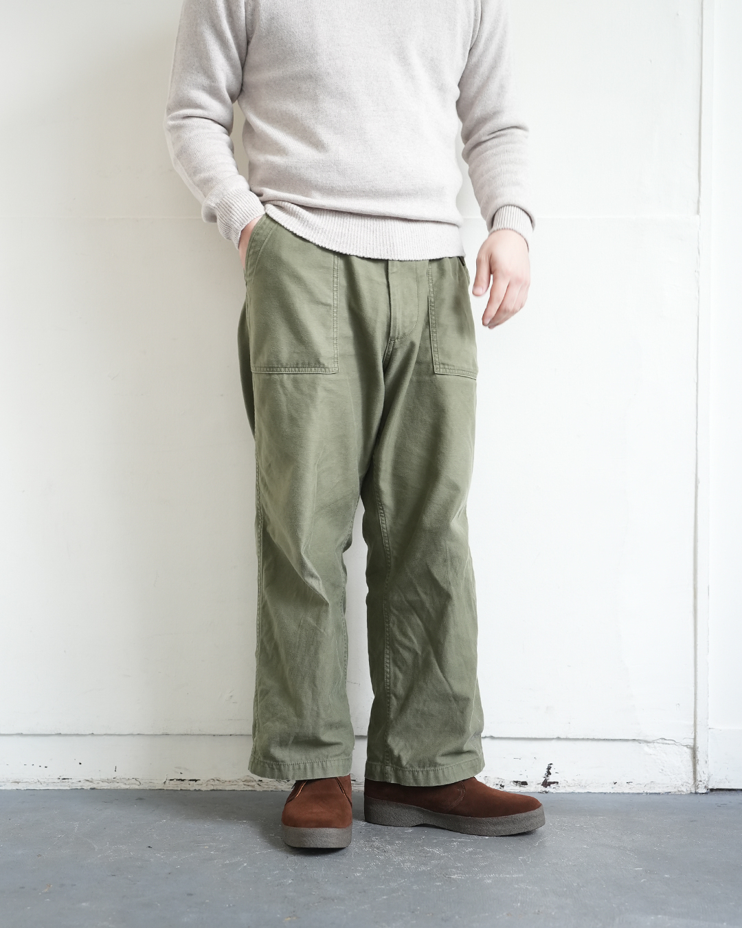 腰まわりやヒップ、太腿はたっぷりと生地が余ってますが個人的には古着を穿く感覚でしっくりきてます。ブランドでは同じ生地を使って2種類のシルエットを展開しておりましてスッキリがお好みであればこちらで、太さがお好きな方は是非ご紹介のモデルをお選びください。