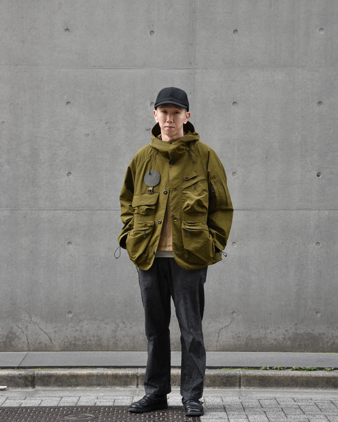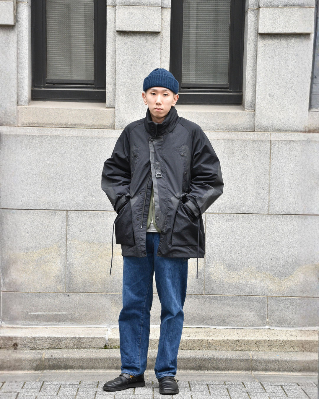 大き目でかつField Jacketよりもストンと落ちる印象のあるシルエットは、太めのパンツとお合わせいただいてバランスをとるのがよろしいかと思います。このスピンドルはサイズアップで太めです。