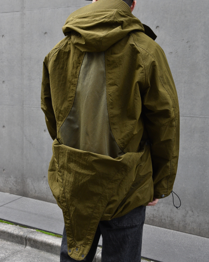 こちらはハードタッチの撥水塩縮ナイロン素材にプリント補強を施したマウンテンパーカー。