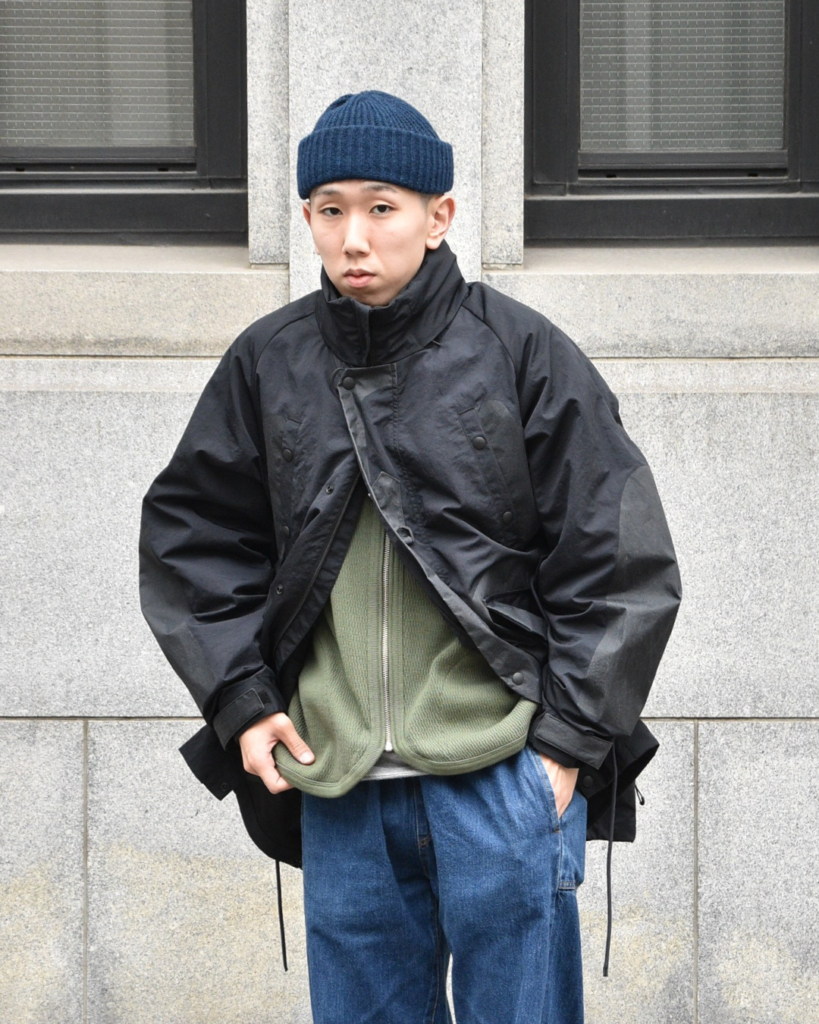 どこかミリタリーな要素を感じる一着ですので、BARNSのサーマルカーディガンとレイヤードして雰囲気を合わせてみました。