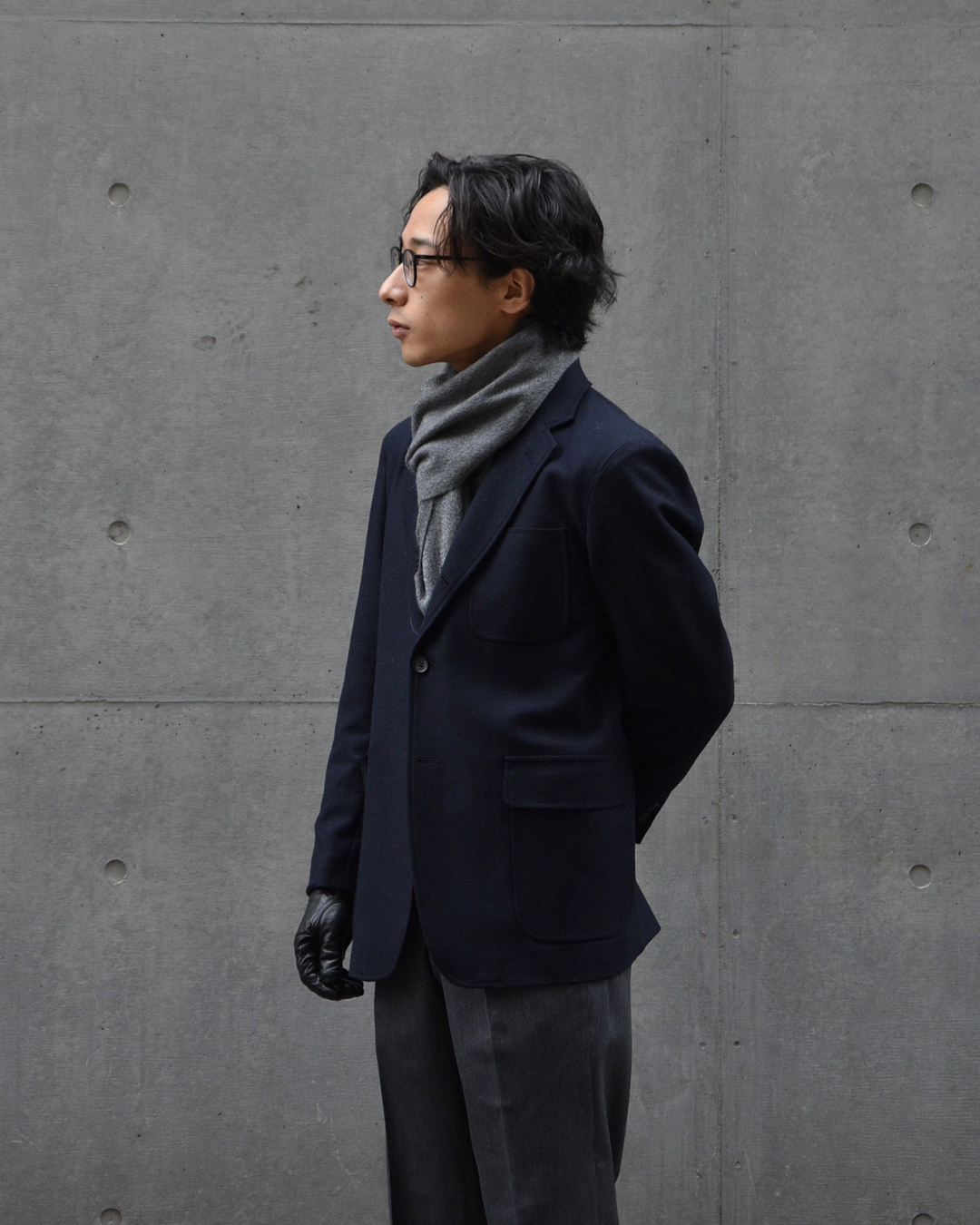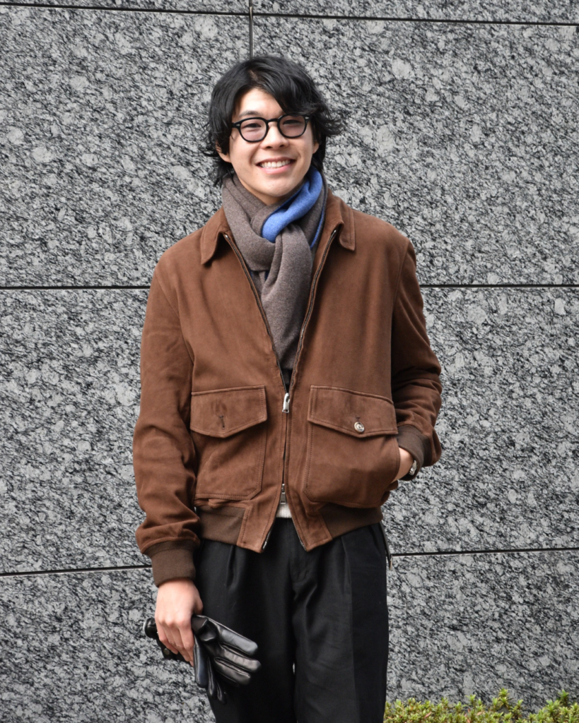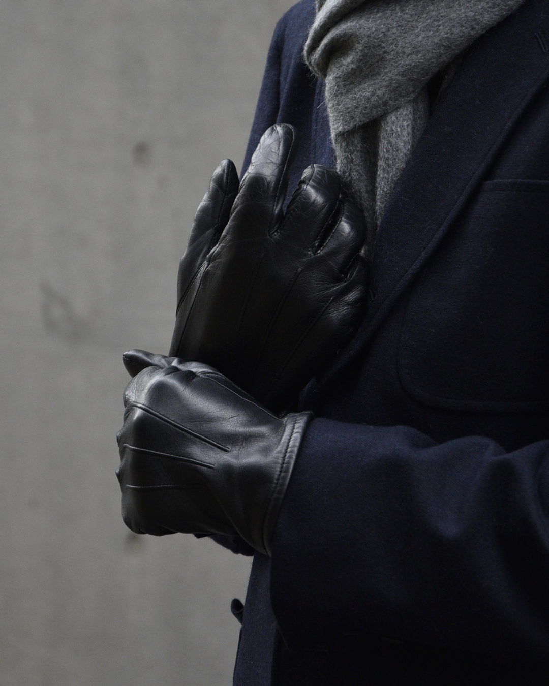 STYLE2でご覧いただきましたように、トラッドと相性抜群なのがマフラーと革手袋ですが、テック系のアウターと合わせてコントラストをお楽しみいただくのも一興。