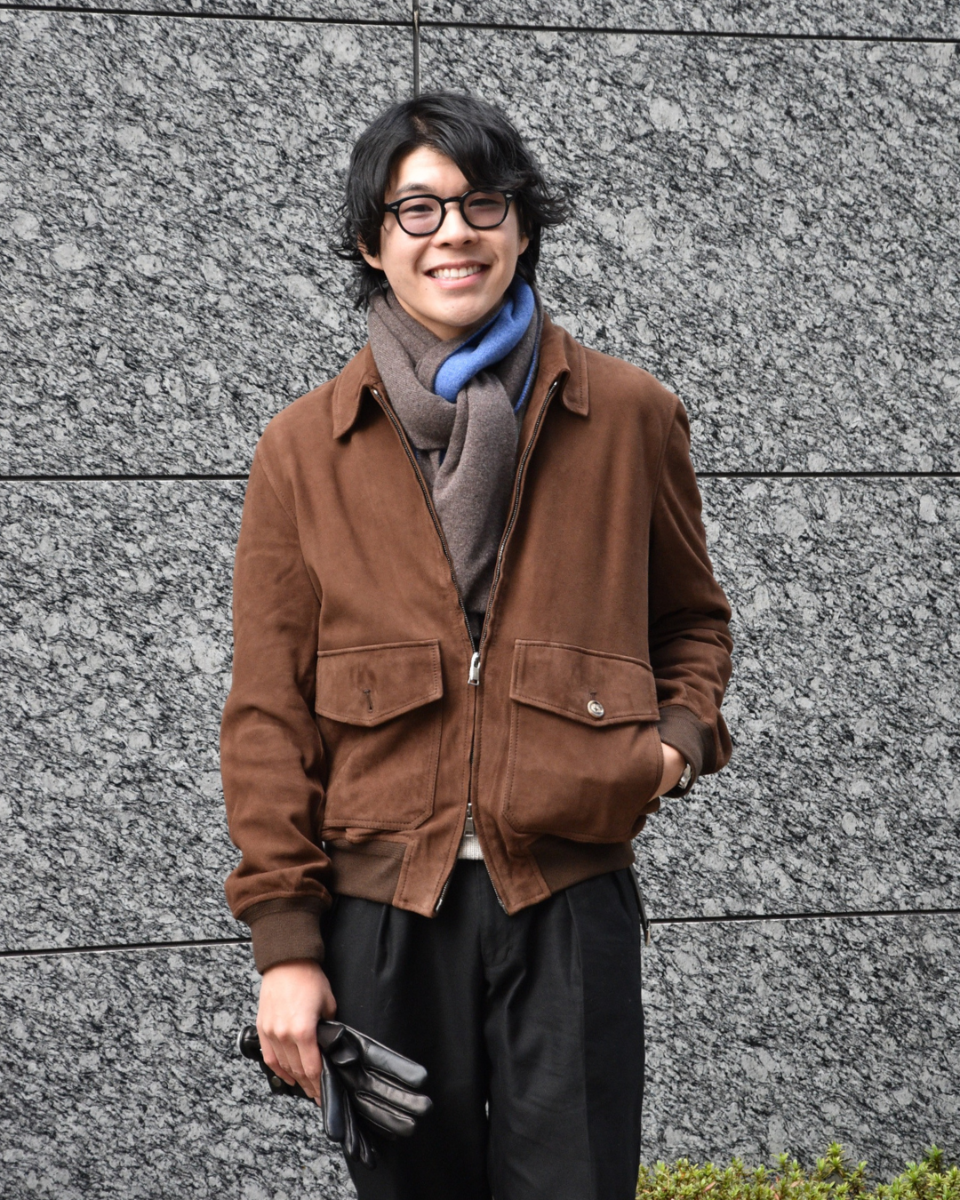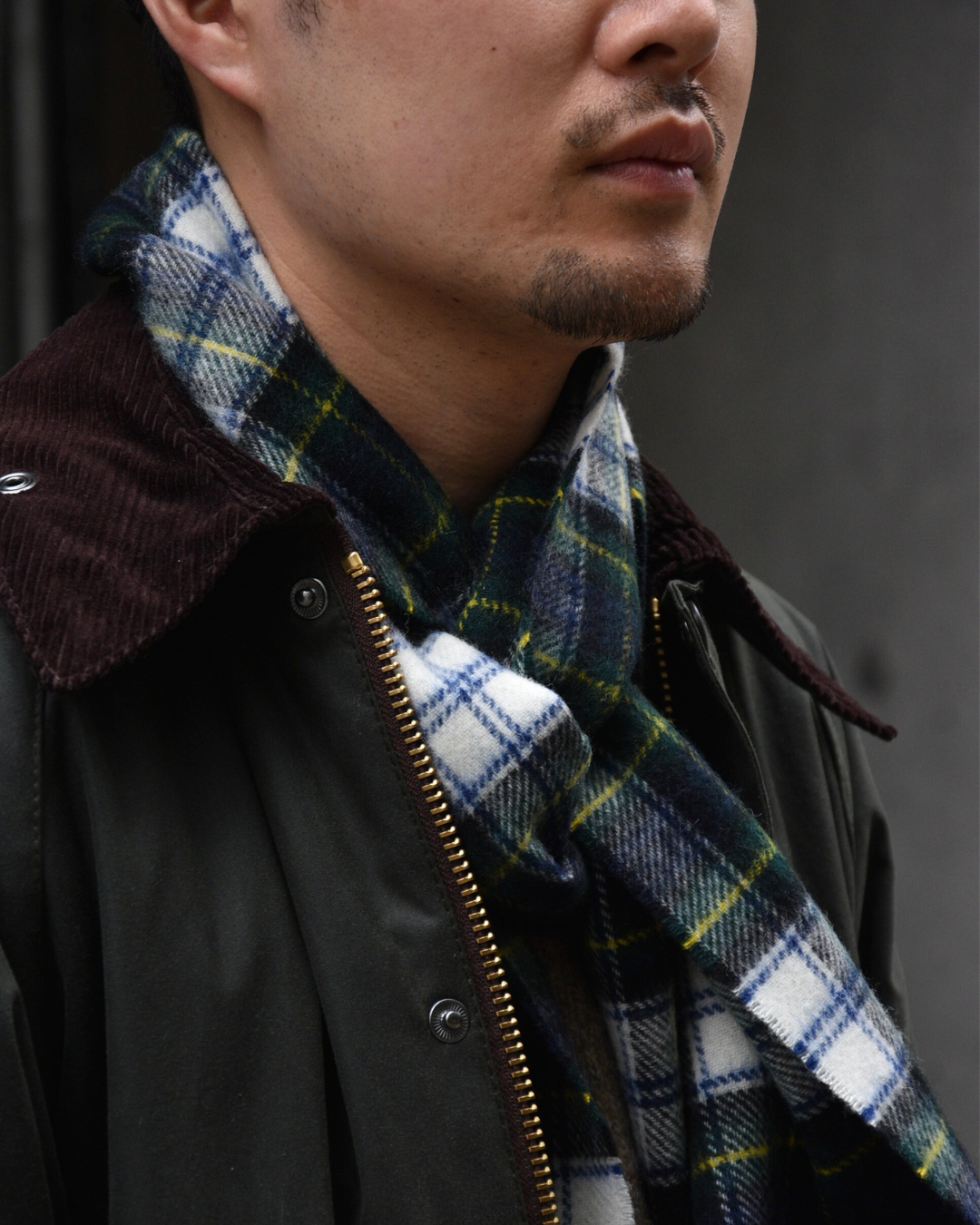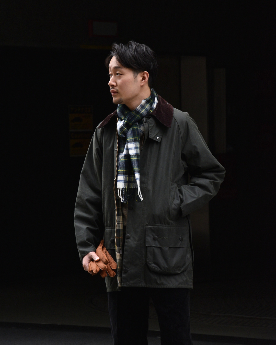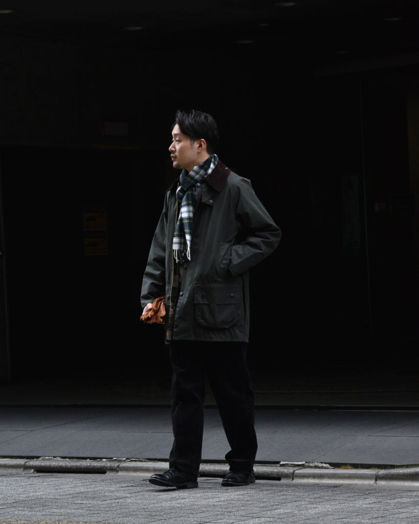 武骨なバブアーと合わせて、マフラーは軽さを出すために柄モノを、手袋も敢えてブラックから外してみましょう。