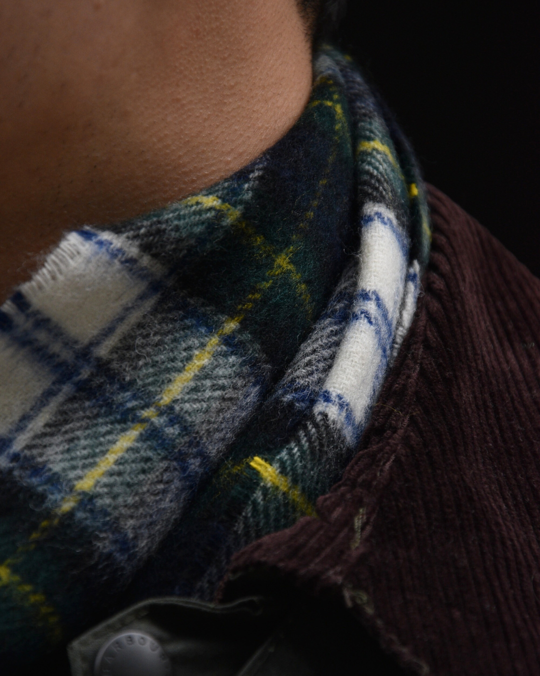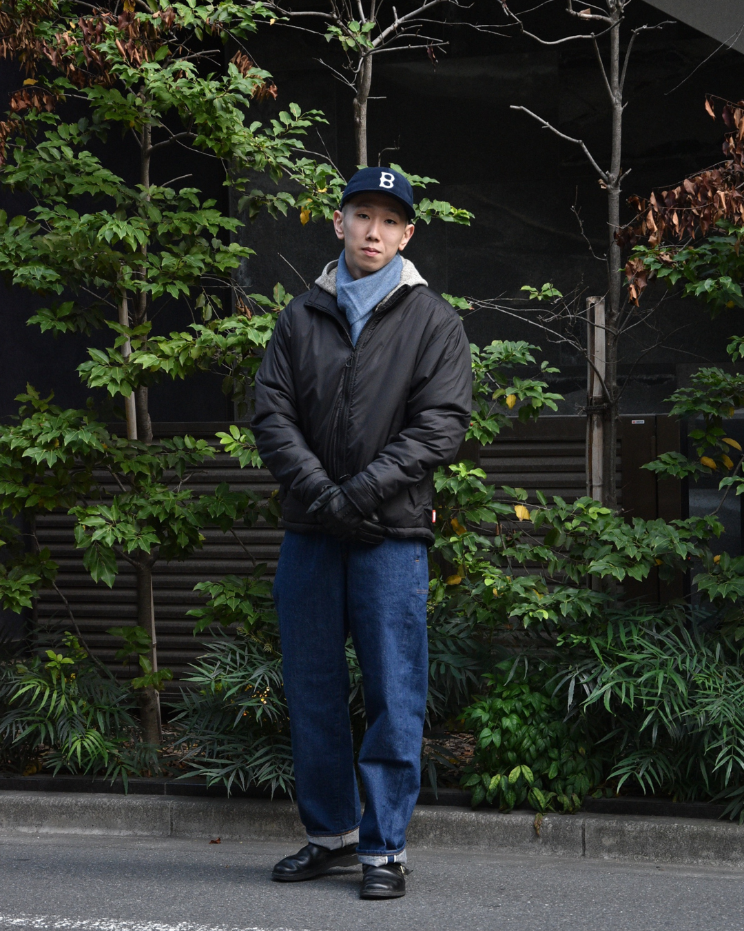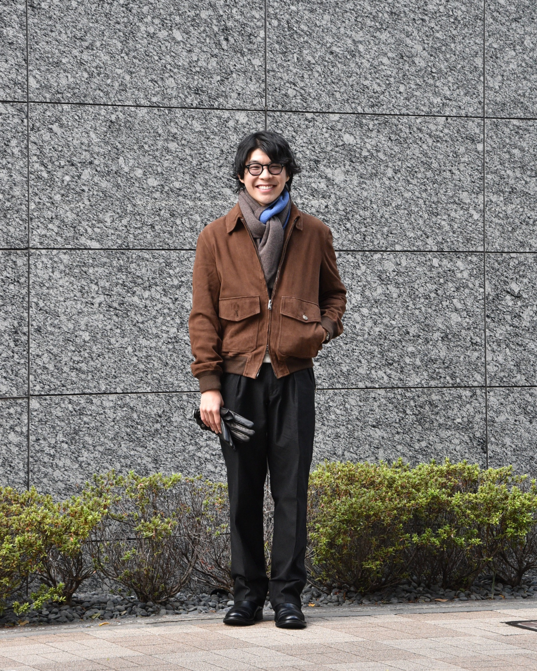 武骨なバブアーと合わせて、マフラーは軽さを出すために柄モノを、手袋も敢えてブラックから外してみましょう。