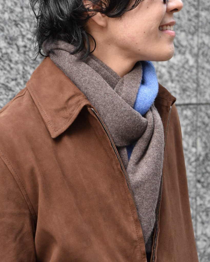 ハリスのカシミヤマフラーは今回ご紹介させていただく中でも随一の着用感。
