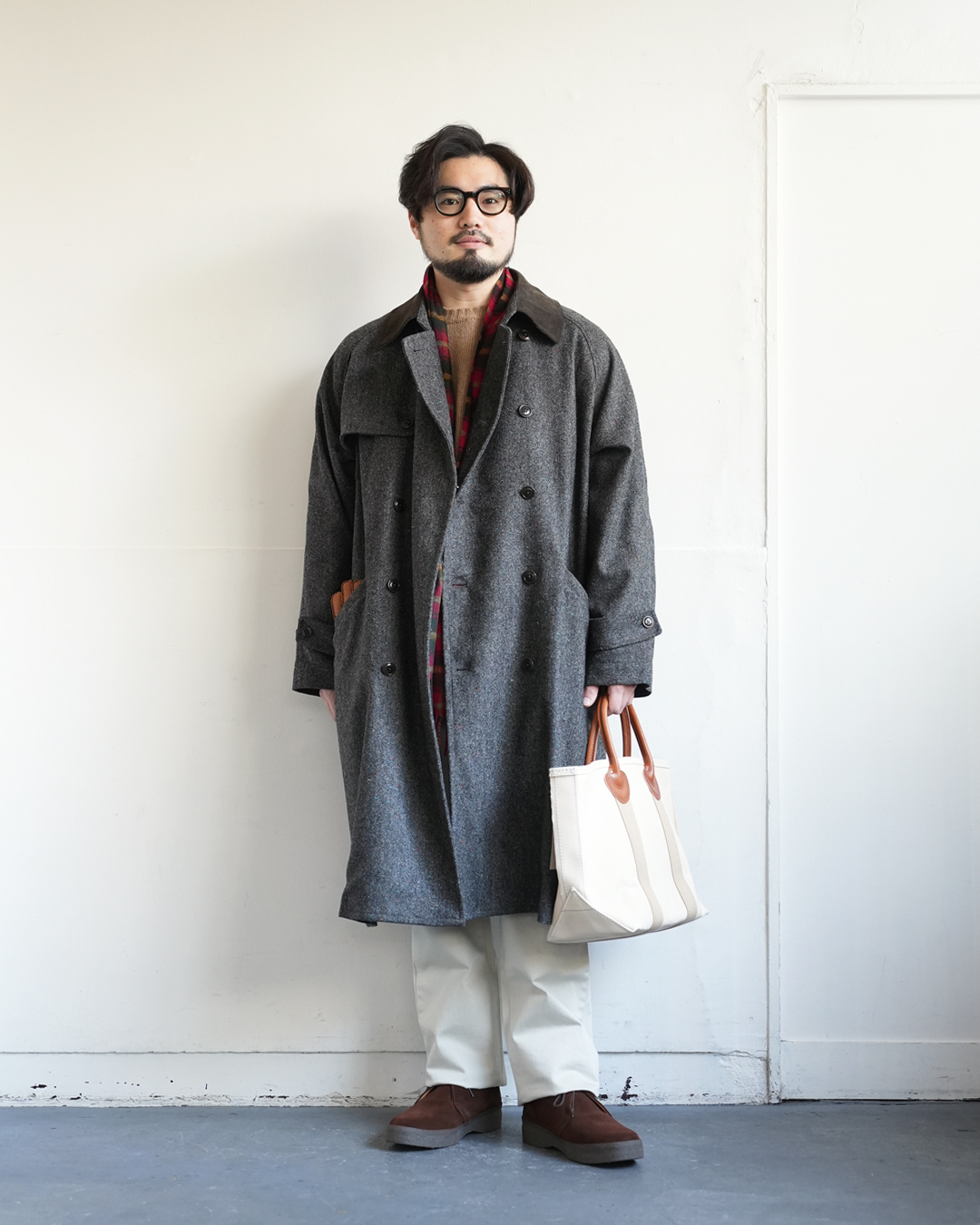 さっきはパンツにツイードでしたが、コートにツイードも良い感じです。