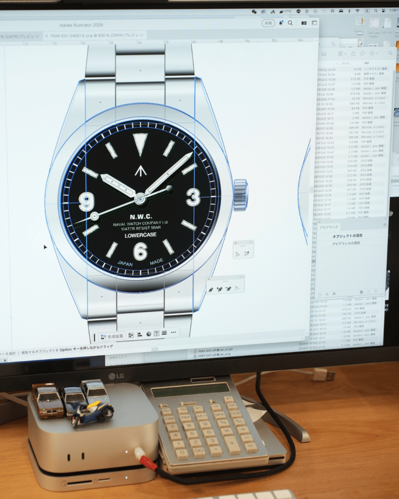 文字盤は イラストレーター を使ってゼロから描き起こすのだが、その工程は驚くほどアナログで地道。ケースサイズやベルトの仕様も、この段階で少しずつ形にしていく。