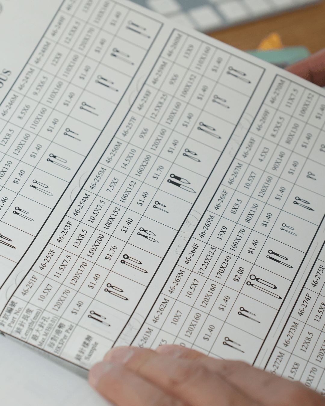針のカタログ。これもかなりのバリエーションがある。針もオリジナルでデザインを起こすことが多いので使わない場合も多い。