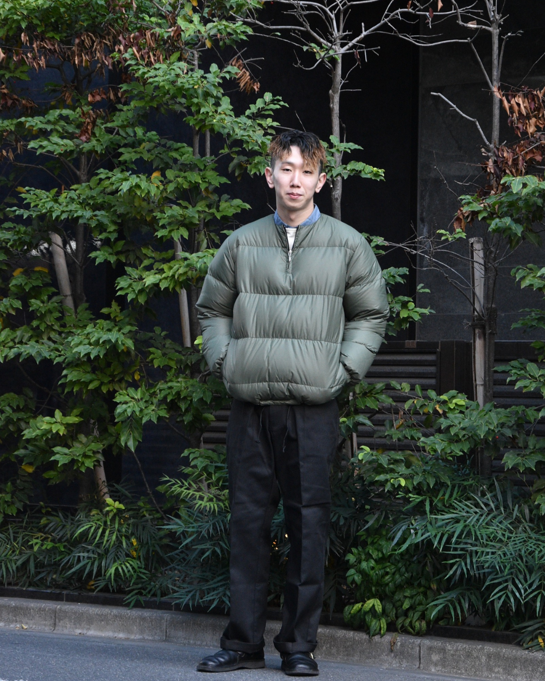 あとはお色味が真っ黒、ではないので、ダウンベスト、靴と温度の違う黒たちで合わせていただくのもタノシーです。
