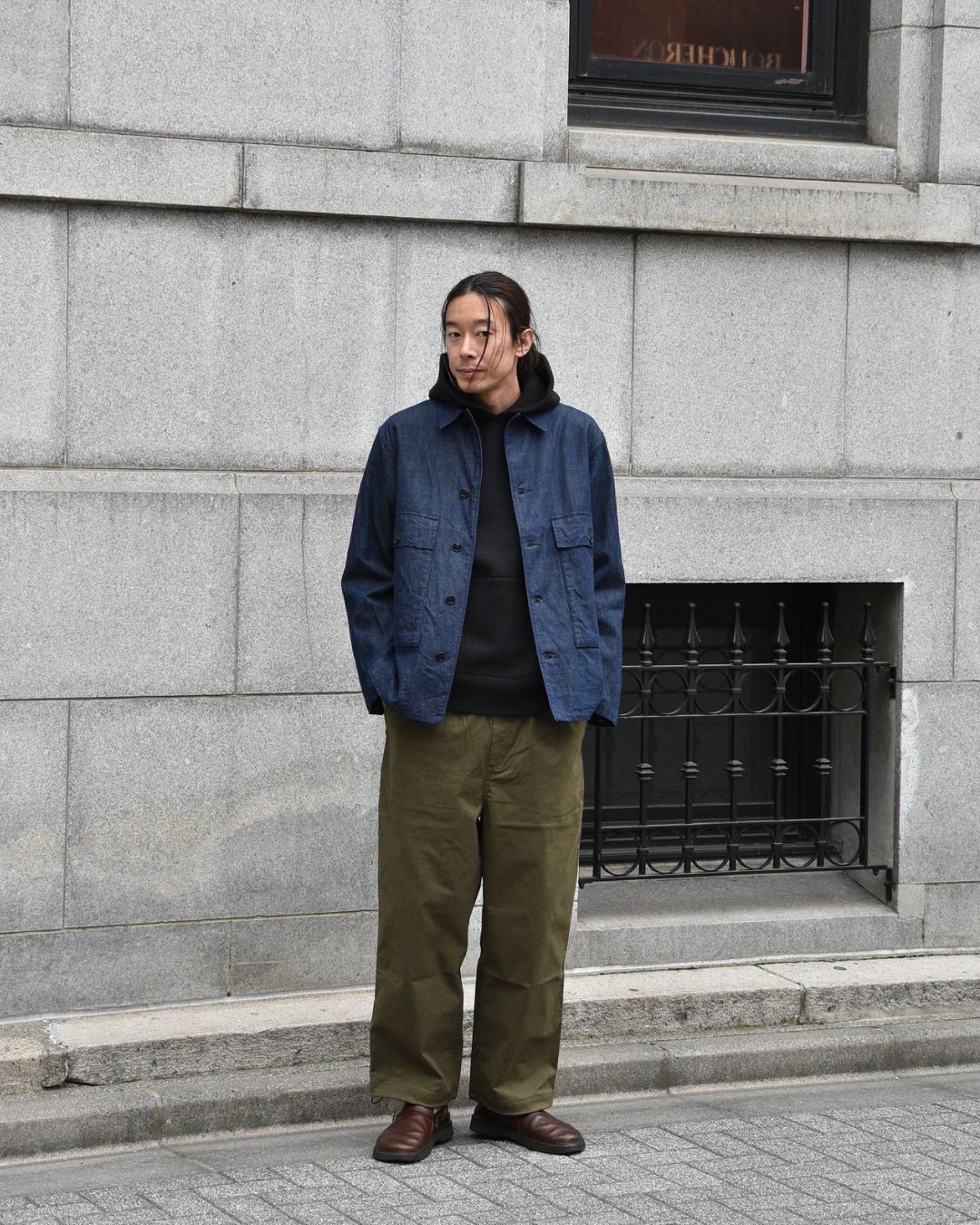 デニムにスウェット・オリーブパンツのらしい組み合わせも、コテッとした感じにはならずどこかモダンなバランスになる1着です。