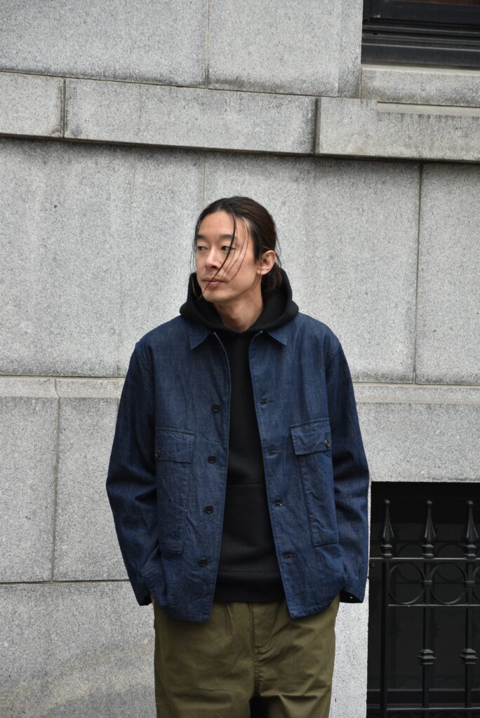 40年代米海軍ユーティリティジャケットのディテールをベースに、実用性を高めたポケット配置(フラップ+サイドポケットなど)を採用。ワーク寄りの武骨さと現代的な使い勝手を両立している。