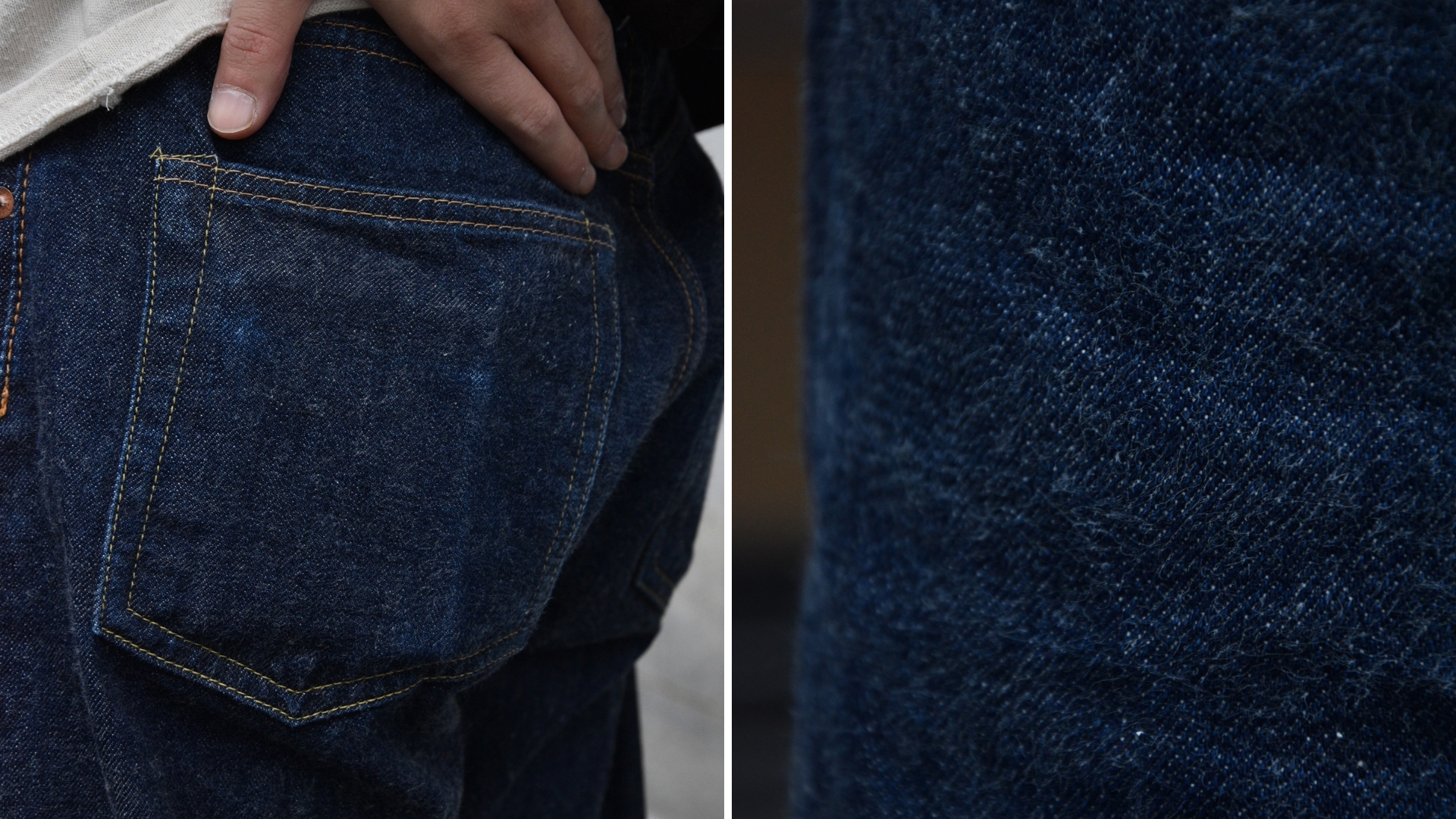 バックポケットはたばこのケースでちょっと角が立ってます。破かないようにしなきゃですね。しかし、入れてたモノのアタリはダメージになってもなんか魅力に感じるものです。
