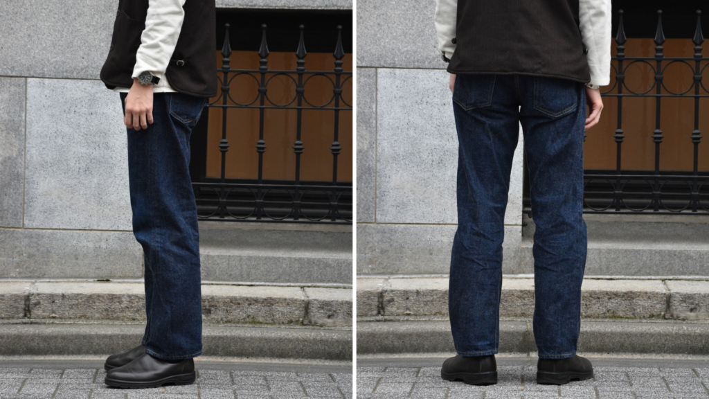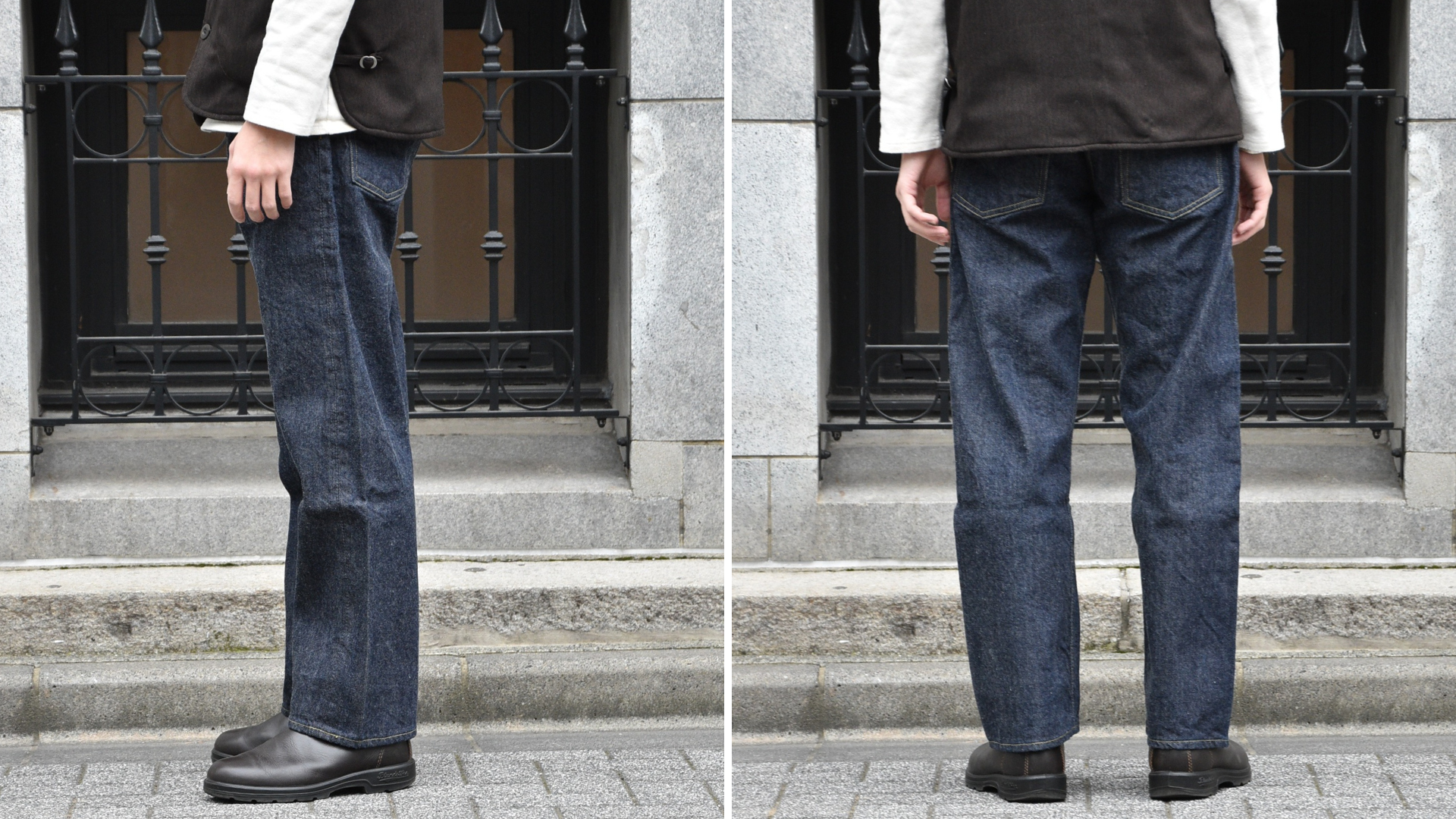 新品の同サイズだとこんな感じです。新品の方が太く感じますね。加えて生地の斜行、色味の変化も起こっていますね~