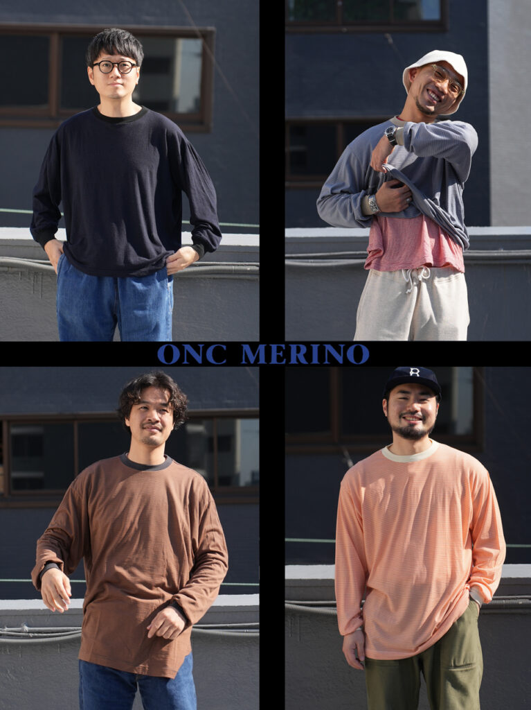 スウェットからジーンズまで、様々な着こなしにONC MERINO。