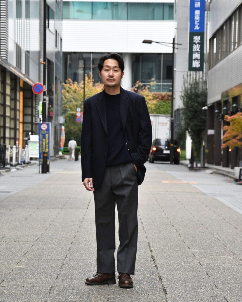 お仕事シーンでもおすすめできるネイビージャケットにグレーのスラックス。