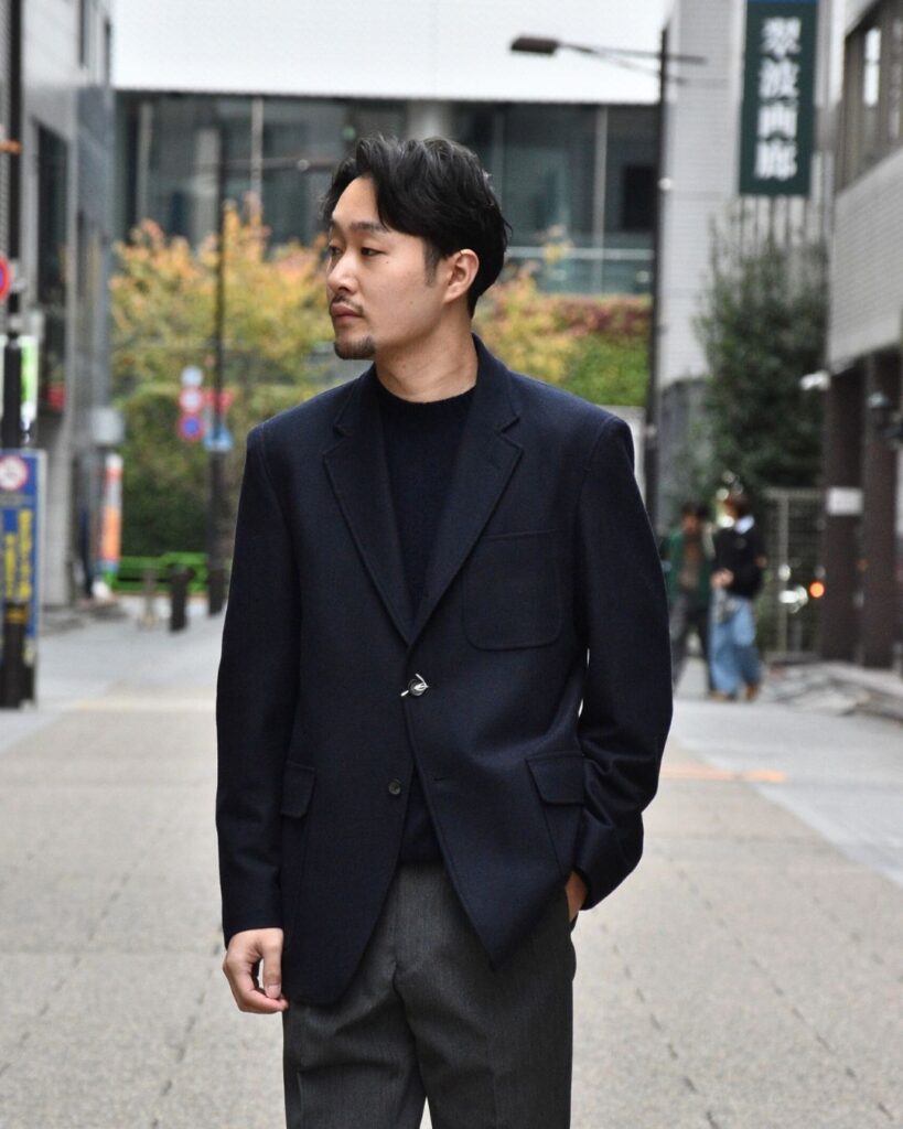 カジュアルなアウターとも合わせやすいように、ウールギャバジンを採用しておりますがやはり合わせていただきたいのがジャケット。