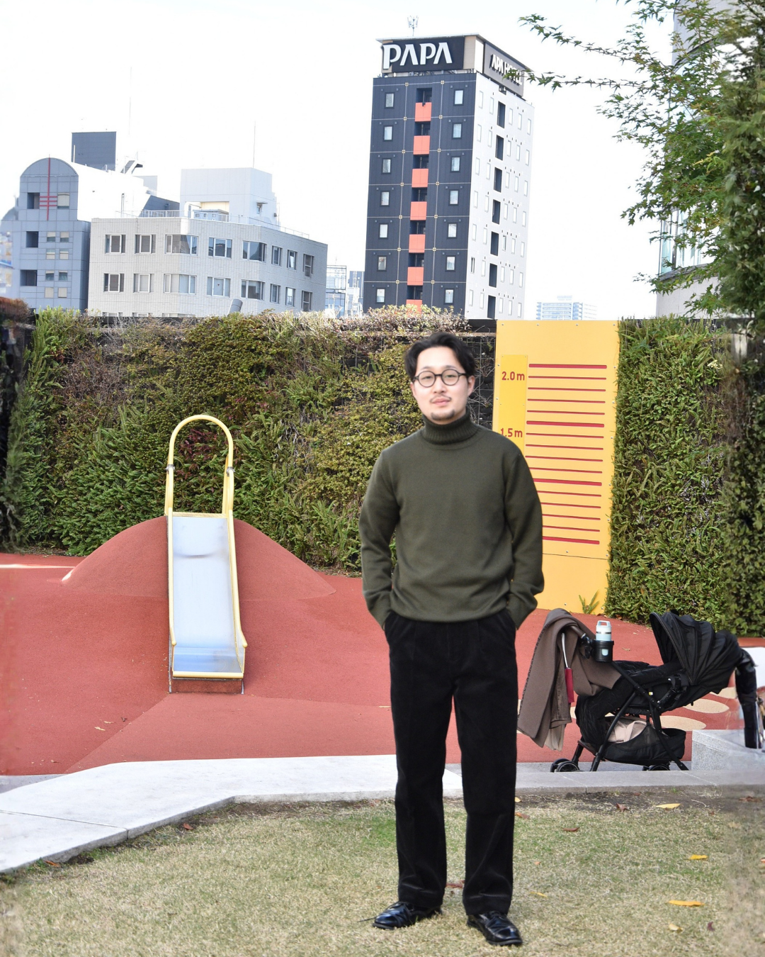 MoonCastleのタートルネックニット、中でもヘビーウエイトの物をチョイス。そうすることで、カサネギをせずとも暖かく、脱いで銀座の劈くようなビル風に当たっても、負けない。動きやすくて子どもと遊ぶのに全く問題が無い。それでいて